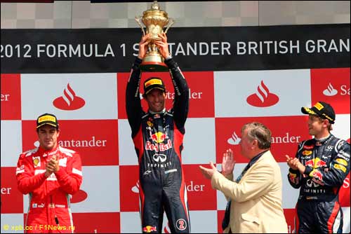 ![]() Британскую погоду часто называют непредсказуемой, но в пятницу она точно совпала с прогнозом – весь день лил дождь и гонщики почти не покидали боксы. Утром в субботу выглянуло солнце, и у команд был только час, чтобы поработать с настройками и резиной, а квалификация получилась дождевой и была прервана на полтора часа, когда воды на трассе оказалось слишком много. Прогноз обещал осадки и в воскресенье, и при настройке машин многие сделали ставку на дождь, но трасса была влажной только утром, а перед стартом выглянуло солнце. Виталий Петров не вышел на старт. На формировочном круге мотор заглох, а после возвращения машины в боксы механики обнаружили резкое падение давления масла. После дождевой квалификации гонщики могли свободно выбирать резину для первого отрезка. В первой десятке Алонсо и Хэмилтон стартовали на Hard. На старте Алонсо сохранил преимущество поула, Масса опередил Феттеля, Мальдонадо - Райкконена. Ди Реста пробил заднее правое колесо, зацепив машину Грожана, и отправился в боксы для замены, потом заехал ещё раз и выбыл из борьбы из-за повреждения подвески. Перес отыграл шесть позиций. Первая десятка на третьем круге: Алонсо – Уэббер – Шумахер – Масса – Феттель – Мальдонадо – Райкконен – Хэмилтон – Перес – Сенна. На 10-м круге Феттель первым отправился на пит-стоп. На 11-м Масса опередил Шумахера, а Мальдонадо и Перес сменили резину. После возвращения на трассу между гонщиками произошел контакт, Серхио остановил машину на траве, а Пастор медленно вернулся в боксы, но смог продолжить гонку. На 13-м круге Шумахер сменил резину, на 14-м – Масса и Райкконен, на 15-м – Уэббер, на 16-м – Алонсо и Росберг, на 17-м – Кобаяши, Хюлкенберг и Баттон, поднявшийся на седьмую строчку. На 19-м круге Алонсо опередил Хэмилтона и вернул лидерство, а на 22-м британец провёл пит-стоп. Первая десятка на 23-м круге: Алонсо – Уэббер – Феттель – Масса – Шумахер – Райкконен – Хэмилтон – Грожан – Кобаяши – Хюлкенберг. На 24-м круге Райкконен опередил Шумахера в борьбе за пятое место, и почти сразу Михаэля обошёл и Хэмилтон. На 27-м круге Грожан провёл пит-стоп, на 29-м Хэмилтон получил комплект жестких шин – в McLaren выбрали короткий средний отрезок на Soft. На 31-м круге Хэмилтон и Грожан сначала опередили Росберга, а потом Баттона. На 32-м круге Феттель и Баттон сменили резину, на 34-м – Уэббер, на 35-м – Райкконен и Шумахер, на 36-м – Масса и Хюлкенберг. Грожан опередил Хэмилтона в борьбе за восьмое место. Алонсо лидировал в гонке, контролируя отрыв от Уэббера, но Марк взвинтил темп на свежей резине, и на 38-м круге Фернандо свернул в боксы, сохранив лидерство. На том же круге сменили резину Росберг – у механиков Mercedes возникла заминка, и Кобаяши - Камуи заблокировал шины перед боксами и сбил нескольких механиков. Первая десятка на 40-м круге: Алонсо – Уэббер – Феттель – Масса – Райкконен – Грожан – Хэмилтон – Шумахер – Хюлкенберг – Сенна. Алонсо использовал Soft на финальном отрезке, а Уэббер – Hard. За семь кругов до финиша темп машины Фернандо снизился, Марк быстро отыграл отставание и на 48-м круге вышел вперёд, возглавив гонку. Марк Уэббер выиграл гонку, одержав девятую победу в карьере и вторую в сезоне. Алонсо финишировал вторым, сохранив лидерство в личном зачёте, а третье место Феттеля позволило Red Bull Racing закрепить лидерство в Кубке конструкторов. Лучший круг: Кими Рай