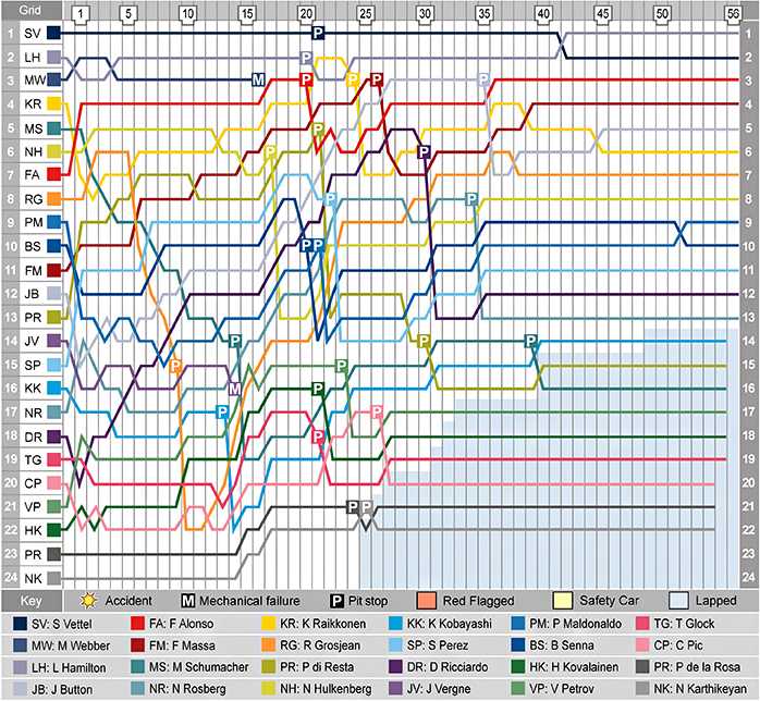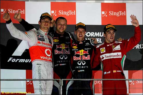 * к результату Уэббера добавлено 20 секунд за обгон за пределами трассы ** к результату Пика добавлено 20 секунд за обгон под красными флагами в квалификации Причины сходов: Л.Хэмилтон - McLaren - 22 - коробка передач Н.Картикеян - HRT - 30 - авария П.Мальдонадо - Williams - 36 - гидравлика М.Шумахер - Mercedes - 38 - авария Ж.Вернь - Toro Rosso - 38 - авария Положение в ЛИЧНОМ ЗАЧЕТЕ после Гран-При СИНГАПУРА