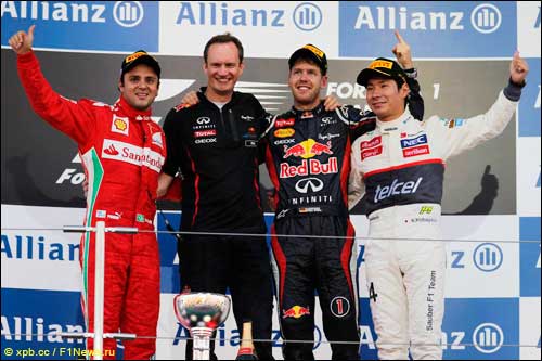 ![]() Гонщики Red Bull Racing доминировали в квалификации, заняв первый ряд стартового поля, но борьба позади них получилась весьма напряженной, а четыре судейских решения с потерей десяти позиций для Шумахера, пяти для Баттона и Хюлкенберга и трёх для Верня ещё больше перемешали пелотон. Шумахер, Вернь и Пик выбрали состав Hard для первого отрезка, остальные стартовали на Soft. На старте Феттель сохранил преимущество поула, Кобаяши опередил Уэббера, за ними произошла авария – лидер чемпионата Алонсо выбыл из борьбы после контакта с Райкконеном, Грожан врезался в Уэббера – оба гонщика Lotus стали участниками инцидентов, Росберг остановил машину после контакта с Сенной. Выехал автомобиль безопасности. Первая 10-ка за автомобилем безопасности: Феттель – Кобаяши – Баттон – Масса – Райкконен – Перес – Хэмилтон – Хюлкенберг – Мальдонадо – Риккардо. Грожан, Уэббер и Сенна заехали в боксы для замены носовых обтекателей. На 3-м круге гонщики смогли продолжить борьбу. Феттель сохранил лидерство, быстро отрываясь от Кобаяши. Перес опередил Хэмилтона в борьбе за шестую позицию. Стюарды наказали Грожана 10-секундной остановкой в боксах за контакт с Уэббером. Первая 10-ка на десятом круге: Феттель – Кобаяши – Баттон – Масса – Райкконен – Перес – Хэмилтон – Хюлкенберг – Мальдонадо – Риккардо. На 14-м круге Баттон, Райкконен, Хюлкенберг и ди Реста сменили резину, на 15-м – Кобаяши, на 16-м – Перес, на 17-м – Хэмилтон, Мальдонадо и Сенна, на 18-м – Феттель, Масса, Риккардо и Шумахер. Перес атаковал Хэмилтона по внешнему радиусу в шпильке 11-го поворота, но вылетел с трассы и выбыл из борьбы. Первая 10-ка на 20-м круге: Феттель – Масса – Кобаяши – Баттон – Райкконен – Хэмилтон – Хюлкенберг – Мальдонадо – Уэббер – Риккардо. Стюарды наказали Бруно Сенну штрафным проездом по пит-лейн за стартовый инцидент с Росбергом. Шумахер опередил ди Ресту в борьбе за 11-ю позицию. На 27-м круге Уэббер сменил резину, на 31-м – Райкконен, на 32-м – Кобаяши, Хэмилтон и Хюлкенберг. Льюис вернулся на трассу, когда Райкконен проезжал мимо выезда с пит-лейн и вышел вперёд, удержавшись внутри поворота. На 33-м круге ди Реста провёл пит-стоп, на 34-м – Мальдонадо сменил шины, а Картикеян выбыл из борьбы, остановив машину в боксах. На 35-м круге Риккардо и Сенна провели пит-стоп, на 36-м – Баттон – возникла заминка с креплением заднего правого колеса, на 37-м – Масса и Шумахер, на 38-м – Феттель. Первая 10-ка на 40-м круге: Феттель – Масса – Кобаяши – Баттон – Хэмилтон – Райкконен – Хюлкенберг – Мальдонадо – Уэббер – Риккардо. Шарль Пик выбыл из борьбы из-за проблем с мотором. Виталий Петров получил штраф с проездом через боксы за игнорирование синих флагов. Феттель лидировал с преимуществом в двадцать секунд над Массой, Баттон прессинговал Кобаяши в борьбе за третье место – борьба продолжалась до последнего поворота, но японец не позволил британцу подобраться на дистанцию атаки. Себастьян Феттель уверенно выиграл гонку, лидируя от старта до финиша – немец одержал вторую победу подряд, третью победу в сезоне и 24-ю в карьере. Фелипе Масса финишировал вторым – впервые поднявшись на подиум после Гран При Кореи 2010 года, а Камуи Кобаяши реализовал детскую мечту, поднявшись на подиум в Сузуке. Третье место на финише – лучший результат в карьере японца. Болельщики скандировали его имя во время церемонии награжд