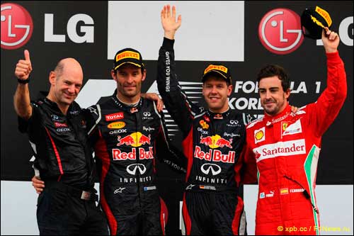 ![]() Вторую гонку подряд пилоты Red Bull Racing начинали с первого ряда стартового поля, но если неделю назад в Сузуке с поула стартовал Себастьян Феттель, то в Корее лучшее время в квалификации показал Марк Уэббер. Двое гонщиков на стартовом поле Гран При Кореи потеряли позиции относительно результатов квалификации. Шарль Пик был наказан потерей десяти мест за девятую замену мотора, а Даниэль Риккардо потерял пять мест за замену коробки передач. Состав Soft на стартовый отрезок выбрали Баттон, Перес, Кобаяши, ди Реста, Вернь и де ла Роса, остальные стартовали на SuperSoft. Феттель опередил Уэббера в первом повороте, Алонсо – Хэмилтона. Кобаяши ошибся на торможении, врезавшись в машины Баттона и Росберга – Дженсон выбыл из борьбы, Камуи отправился в боксы для замены носового обтекателя. Первая десятка на втором круге: Феттель – Уэббер – Алонсо – Хэмилтон – Масса – Райкконен – Хюлкенберг – Грожан – Перес – Шумахер. Росберг остановил машину на прямой, появились желтые флаги, лишив гонщиков возможности атаковать в зоне DRS. Эвакуация затянулась, руководство гонки временно запретило гонщикам использовать DRS. Стюарды наказали Кобаяши штрафной остановкой в боксах за столкновение с Баттоном. На 14-м круге Хэмилтон, Хюлкенберг, Грожан, Шумахер, Вернь и Ковалайнен сменили резину, на 15-м – Уэббер, Масса, Райкконен, Риккардо, Петров, Сенна и Глок, на 16-м – Феттель, Алонсо и ди Реста. Перес не поехал в боксы и терял позицию за позицией. Кобаяши и де ла Роса выбыли из борьбы, остановив машины в боксах. Перес сменил резину на 19-м круге. На 21-м Масса опередил Хэмилтона в борьбе за четвёртую позицию и быстро оторвался. Последним первый пит-стоп провёл Мальдонадо – на 22-м круге. На 24-м Райкконен опередил Хэмилтона в зоне DRS в борьбе за пятое место, но Льюис сразу отыгрался. На 25-м круге Вернь опередил Шумахера в борьбе за десятое место. Первая десятка на 25-м круге: Феттель – Уэббер – Алонсо – Масса – Хэмилтон – Райкконен – Хюлкенберг – Грожан – Риккардо – Вернь. На 27-м круге Хэмилтон провёл пит-стоп, на 29-м – ди Реста, на 32-м – Грожан, на 33-м – Уэббер, Хюлкенберг и Шумахер, на 34-м – Петров и Сенна. Грожан опередил Хюлкенберга. На 35-м круге Перес и Алонсо сменили резину, на 36-м – Риккардо, Масса, Феттель и Райкконен. На 38-м круге ди Реста опередил Шумахера в борьбе за 11-е место, Вернь провёл второй пит-стоп. Масса проезжал круги быстрее Алонсо, но команда попросила его «сохранять дистанцию». Грожан атаковал Хэмилтона, чем воспользовался Хюлкенберг, опередив обоих. Первая десятка на 41-м круге: Феттель – Уэббер – Алонсо – Масса – Райкконен – Хюлкенберг – Хэмилтон – Грожан – Риккардо – Вернь. На 43-м круге Хэмилтон провёл третий пит-стоп, получив комплект SuperSoft на финальный отрезок, но не смог опередить Верня в борьбе за десятую позицию – машина Toro Rosso имела преимущество в скорости на прямой. На 53-м круге Жан-Эрик обогнал Риккардо в борьбе за восьмую позицию. Себастьян Феттель уверенно выиграл гонку, одержав 25-ю победу в карьере, четвёртую в сезоне и третью подряд – немец покидает Корею лидером чемпионата. Марк Уэббер финишировал вторым – гонщики Red Bull Racing завоевали дубль, закрепив преимущество команды в Кубке конструкторов, а Ferrari опередила McLaren, поднявшись на вторую строчку. После двухнедельного перерыва нас ждут ещё две сдвоенных гонки – в Индии и Абу-Даби. Число претендентов