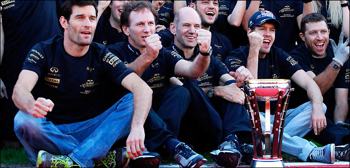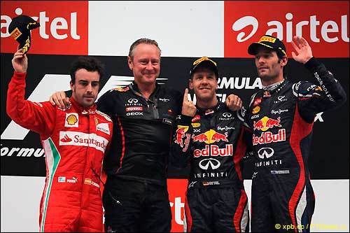 ![]() В решающей фазе сезона Red Bull Racing удалось переломить ситуацию в свою пользу. Себастьян Феттель выиграл три гонки подряд и приехал на индийский этап лидером чемпионата, опережая Фернандо Алонсо на шесть очков. По ходу всех сессий уик-энда Феттель неизменно занимал первую строчку, а в квалификации гонщики Red Bull вновь завоевали первый ряд. Со второго стартовали пилоты McLaren, с третьего – Ferrari. На индийском этапе обошлось без штрафов с потерей позиций – лишь в третий раз за сезон расстановка пилотов на стартовом поле соответствовала протоколу квалификации. Перед стартом шинники говорили, что дистанцию можно проехать и с одним пит-стопом, но команды принимали решение уже во время гонки, оценивая износ шин на первом отрезке. Шумахер, Риккардо, Грожан и Кобаяши стартовали на Hard, остальные стартовали на Soft. На старте Феттель сохранил преимущество поула. Баттон, Хэмилтон и Алонсо вели напряженную борьбу за позицию позади Уэббера, в итоге Дженсон оказался третьим, а Фернандо опередил Льюиса. У Шумахера произошел прокол после контакта с Вернем – оба гонщика отправились в боксы. Первая десятка на 2-м круге: Феттель – Уэббер – Баттон – Алонсо – Хэмилтон – Масса – Райкконен – Перес – Хюлкенберг – Росберг. К 4-му кругу Феттель оторвался от Уэббера на две секунды, Алонсо опередил Баттона в борьбе за третью позицию, а на 6-м Дженсона опередил Хэмилтон. Первая десятка на 10-м круге: Феттель – Уэббер – Алонсо – Хэмилтон – Баттон – Масса – Райкконен – Перес – Хюлкенберг - Росберг. Пелотон растянулся. На 15-м круге Хюлкенберг обогнал Переса в борьбе за 8-е место, и Серхио свернул в боксы для смены шин. На 17-м Грожан опередил Мальдонадо в борьбе за десятое – их борьбой воспользовался Сенна, опередив Пастора. На 20-м круге Перес пробил колесо после контакта с Риккардо и ещё раз заехал в боксы, потом ещё – и сошел с дистанции. На 23-м круге Грожан обогнал Росберга в борьбе за 9-ю позицию. На 26-м круге Баттон сменил резину, на 27-м – Сенна, на 28-м – Райкконен, Росберг, Мальдонадо и Риккардо, на 29 – ди Реста, Хюлкенберг и Масса. Фелипе вернулся на трассу рядом с Райкконеном и Кими вышел вперёд, но Масса отыгрался на прямой. На 30-м круге Алонсо провел пит-стоп, на 31-м – Уэббер. Мальдонадо вылетел с трассы из-за прокола после контакта с Кобаяши, но смог вернуться в боксы. На 32-м круге Петров сменил резину, на 33-м – Хэмилтон получил новые шины и руль, на 34-м Феттель провёл пит-стоп, на 37-м – Грожан и Кобаяши. Первая десятка на 38-м круге: Феттель – Уэббер – Алонсо – Хэмилтон – Баттон – Масса – Райкконен – Хюлкенберг – Грожан – Росберг. На 46-м круге Педро де ла Роса вылетел с трассы в четвёртом повороте из-за проблем с тормозами. На 48-м круге Алонсо опередил Уэббера в борьбе за второе место. Первая десятка на 50-м круге: Феттель – Алонсо – Уэббер – Хэмилтон – Баттон – Масса – Райкконен – Хюлкенберг – Грожан – Росберг. На 57-м круге Михаэль Шумахер остановил машину в боксах – четвёртая гонка подряд без очков на финише. После пересечения линии финиша Масса и Хюлкенберг не смогли добраться до боксов, остановив машины на трассе – топлива могло не хватить для контрольной пробы. Феттель уверенно выиграл гонку, впервые за карьеру одержав четыре победы подряд в одном сезоне и увеличив лидерство в чемпионате. Алонсо минимизировал потери, финишировав вторым, а Уэббер – третьим, закрепив л