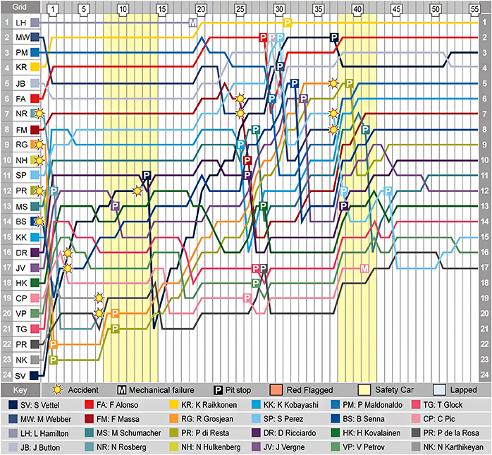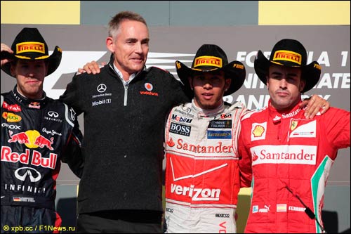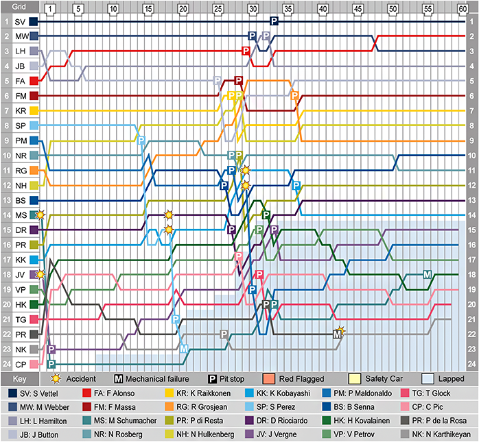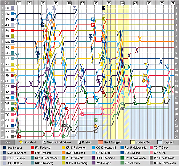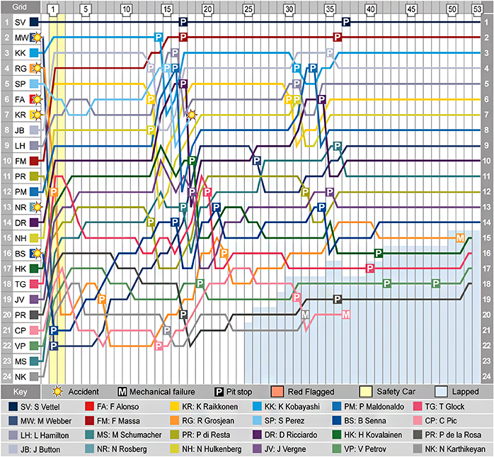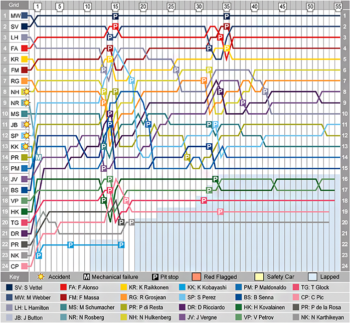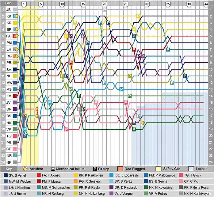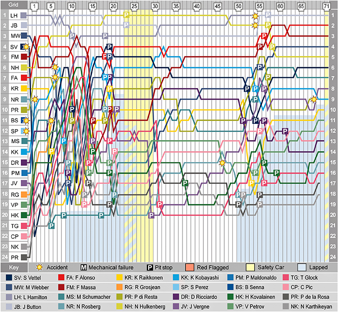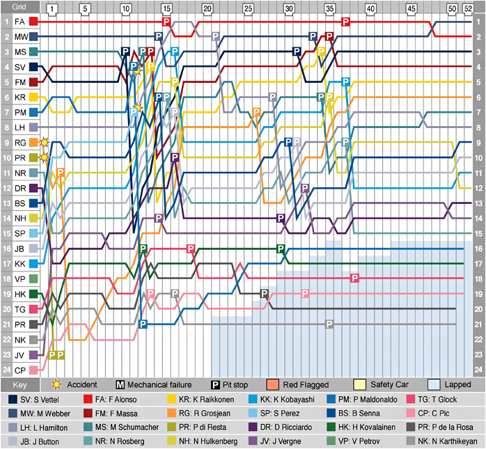 ![]() В субботу Льюис Хэмилтон уверенно завоевал поул – пятый в сезоне и четвёртый подряд для McLaren. Пастор Мальдонадо преподнёс сюрприз, квалифицировавшись вторым, со второго ряда гонку начинали Себастьян Феттель и Дженсон Баттон, а лидер чемпионата Фернандо Алонсо стартовал пятым. Двое пилотов были наказаны потерей пяти позиций на старте за замену коробок передач – Бруно Сенна квалифицировался 17-м, но стартовал 22-м, а Педро де ла Роса замкнул протокол квалификации и стартовал с той же 24-й позиции. Перед стартом на автодроме прошла минута молчания в память о легендарном враче Формулы 1 Сиде Уоткинсе, который скончался на прошлой неделе. Хюлкенберг, Перес, Вернь, Кобаяши, Глок, Пик и де ла Роса выбрали Soft для первого отрезка дистанции, остальные стартовали на SuperSoft. На старте Хэмилтон сохранил преимущество поула, Феттель и Баттон опередили Мальдонадо. Петров откатился на последнее место, лишившись переднего антикрыла в стартовом инциденте – россиянин отправился в боксы, как и Масса, проколовший заднее левое колесо. Первая десятка на 2-м круге: Хэмилтон – Феттель – Баттон – Мальдонадо – Алонсо – ди Реста – Уэббер – Грожан – Росберг – Шумахер. Хэмилтон оторвался от Феттеля на дистанцию, не позволяющую использовать DRS – пара лидеров ехала в очень высоком темпе, постепенно увеличивая преимущество над Баттоном, но потом Дженсон смог сократить отставание. На 9-м круге Уэббер сменил резину, на 11-м – Феттель и Сенна. Вернувшись на трассу, Себастьян опередил Переса. На 12-м круге Алонсо, Шумахер и Риккардо провёли пит-стоп, на 13-м – Хэмилтон, ди Реста, Росберг и Вернь, на 15-м – Мальдонадо и Райкконен, на 15-м – Баттон, Грожан и Кобаяши. Алонсо опередил Переса и Хюлкенберга, но эти гонщики стартовали на более жесткой резине и ещё не были в боксах. Хюлкенберг и Перес сменили резину только на 19-м круге. Первая десятка на 20-м круге: Хэмилтон – Феттель – Баттон – Мальдонадо – Алонсо – ди Реста – Уэббер – Росберг – Грожан – Шумахер. Произошла только одна перестановка – Росберг опередил Грожана на первом пит-стопе. На 23-м круге лидировавший Хэмилтон вынужден был остановить машину из-за проблем с коробкой передач. Гонку возглавил Феттель. На 26-м круге Сенна провёл пит-стоп, на 29-м – Уэббер, на 30-м – Алонсо и Мальдонадо, на 31-м – Кобаяши, на 32-м – Риккардо, на 33-м – Райкконен. Картикеян разбил машину, выехал автомобиль безопасности, большая группа гонщиков свернула в боксы, в том числе и Мальдонадо, только что сменивший резину. Первая десятка за машиной безопасности: Феттель – Баттон – Алонсо – ди Реста – Хюлкенберг – Уэббер – Перес – Росберг – Грожан – Мальдонадо. Инженер сообщил Мальдонадо о проблемах с гидравликой, и Пастор остановил машину в боксах – на десятое место поднялся Вернь. На 39-м круге автомобиль безопасности покинул трассу. Феттель сохранил лидерство. Хюлкенберг опередил Уэббера, но Марк смог отыграться. На торможении в 14-м повороте Шумахер врезался сзади в машину Верня, вновь выехал автомобиль безопасности. Уэббер, Хюлкенберг, Перес и Петров свернули в боксы. Машина Виталия остановилась на выезде с пит-лейн, механики откатили её обратно и россиянин вернулся в борьбу. Первая десятка за машиной безопасности: Феттель – Баттон – Алонсо – ди Реста – Росберг – Грожан – Райкконен – Риккардо – Сенна – Масса. На рестарте Феттель сохранил лиде