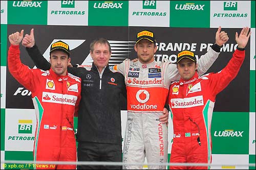 ![]() ГРАН-ПРИ БРАЗИЛИИ - гонка ![]() Финальная, двадцатая гонка рекордного по продолжительности и непредсказуемости сезона, назвала имя обладателя чемпионского титула. Если победа в Кубке конструкторов досталась Red Bull Racing досрочно – команда завоевала его неделю назад в американском Остине, то в личном зачёте всё решалось в Бразилии – перед стартом Себастьян Феттель имел преимущество в 13 очков над Фернандо Алонсо. Впрочем, гонка была особенной не только для претендентов на титул. Михаэль Шумахер в этот день официально завершал карьеру, многие пилоты проводили этап, не имея контракта на следующий сезон, завершалась и короткая история команды HRT, владельцам которой не удалось найти покупателя. В квалификации оба участника битвы за титул уступили напарникам по команде. Себастьян Феттель стартовал четвёртым, на одну позицию позади Марка Уэббера, а Фернандо Алонсо квалифицировался восьмым, три позиции уступив Фелипе Массе, но начинал гонку седьмым из-за штрафа, наложенного на Пастора Мальдонадо. С первого ряда стартовали гонщики McLaren – поул в субботу завоевал Льюис Хэмилтон, проводящий последнюю гонку в McLaren. Традиционно для Интерлагоса одним из факторов интриги стала непредсказуемая погода – в пятницу прогноз обещал 100% вероятность осадков в гонке, и в большинстве команд выбрали дождевые настройки. В субботу короткий дождь прошел перед началом квалификации, потом лил всю ночь, но за несколько часов перед стартом закончился. Гонщики готовились к старту на сликах, когда на трибунах вновь появились зонты – начался небольшой дождь. Шумахер, Кобаяши и Грожан выбрали Hard для первого отрезка, остальные стартовали на Medium. На старте Хэмилтон сохранил преимущество поула, Масса пробился на второе место, а позади него произошел завал, в который попал и Феттель – после контакта с Сенной лидер чемпионата откатился назад, но продолжил борьбу. Сенна и Перес сошли с дистанции, Баттон опередил Массу, Алонсо поднялся на третье место. Первая десятка на 3-м круге: Хэмилтон – Баттон – Алонсо – Хюлкенберг – Уэббер – Масса – ди Реста – Райкконен – Кобаяши – Росберг. Феттель ехал 20-м. Асфальт становился влажным, Алонсо допустил ошибку, но вернулся на трассу четвёртым, пропустив Хюлкенберга – испанца активно прессинговал Уэббер, но Масса помогал напарнику отбивать атаки. На 6-м круге Райкконен и Шумахер побывали в боксах – Кими получил промежуточную резину. Грожан разбил машину, Уэббер допустил разворот, потеряв несколько позиций. К седьмому кругу Феттель уже был 11-м. На восьмом круге Баттон опередил Хэмилтона, возглавив гонку, на 9-м Кобаяши заехал в боксы за промежуточной резиной. Первая десятка на 9-м круге: Баттон – Хэмилтон – Хюлкенберг – Алонсо – Масса – Феттель – ди Реста – Росберг – Риккардо – Вернь. На 10-м круге Росберг, Риккардо и Уэббер сменили резину – только Даниэль выбрал слики. На 11-м круге Хэмилтон, Алонсо, Феттель и ди Реста перешли на промежуточную резину, При обслуживании машины Льюиса в боксах McLaren возникла заминка, а Марк Уэббер зацепил механика с передним домкратом в боксах Red Bull Racing. Дождь стих, но промежуточная резина пока имела преимущество над сликами. На 16-м круге Масса, Вернь и Ковалайнен сменили резину, и только лидеры – Баттон и Хюлкенберг оставались на сликах. Нико подобрался на дистанцию атаки и прессинговал Дженсона – они
