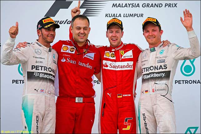 Облачно. Дождь во второй сессии. Воздух +32...24С, трасса +55…26С Погода вновь стала одним из ключевых факторов малайзийского уик-энда. На свободных заездах в пятницу температура асфальта подбиралась к 60 градусам, а утром в субботу он раскалился до 62-х. Сцепление оставляло желать лучшего, машины скользили, гонщики часто вылетали, но без серьёзных последствий. На тренировках лидировали пилоты Mercedes – Росберг возглавил протокол первой и третьей сессии, а Хэмилтон показал лучшее время днём в пятницу, а утром в субботу жаловался на проблемы с тормозами. Результаты гонщиков Ferrari и Williams позади лидеров были очень плотными, но в Малайзии преимущество Ferrari было чуть более явным, чем в Мельбурне. В Австралии в квалификации участвовали девять команд, в Малайзии к ним добавилась Manor, но только с одной машиной – у Стивенса в третьей тренировке возникли проблемы с топливной системой, которые команда не смогла решить к началу квалификации – в итоге на трассу выехал только дебютант Роберто Мери. Прогноз обещал высокую вероятность осадков во время квалификации – в прошлом году из-за грозы её пришлось задержать почти на час. Небо затянули тучи, ветер усилился, вокруг автодрома сверкали молнии, но перед началом квалификации трасса оставалась сухой. Гроза приближалась, и гонщики поспешили покинуть боксы – многие сразу выбрали более мягкие шины Medium, в том числе пилоты Mercedes. Хэмилтон в первой попытке возглавил протокол – 1:39.269. В первой сессии из дальнейшей борьбы выбыли гонщики Manor, McLaren Honda и Фелипе Наср. Роберто Мери не смог преодолеть рубеж 107% от времени лидера. В начале второй сессии на выезде с пит-лейн образовалась очередь – гремел гром, все хотели проехать быстрый круг до дождя – и в итоге успели. Протокол возглавил Росберг – 1:39.376, Хэмилтон показал только восьмое время, Райкконен не попал в десятку, застряв позади Эриксона, и в этот момент начался дождь, завершив борьбу за семь минут до фактического окончания сессии. Гонщики вернулись в боксы, Райкконен, Мальдонадо, Хюлкенберг, Перес и Сайнс не пробились в финал. На автодром обрушился тропический ливень, по трассе текли реки воды, болельщики искали возможность укрыться. Скоро гроза закончилась, на трассу дважды выезжал автомобиль безопасности, в итоге было решено провести финал квалификации с получасовой задержкой. В 18:15 по местному времени на выезде с пит-лейн загорелся зеленый свет. Асфальт оставался влажным – одни выбрали дождевую резину, другие – промежуточную. В первой попытке Хэмилтон на промежуточных шинах возглавил протокол – 1:49.834, после этого и другие переключились на промежуточную резину. Трасса подсыхала, гонщики проехали серию кругов в расчёте, что один из них будет пройден в тот момент, когда состояние асфальта будет лучшим, но результат Хэмилтона никто улучшить не смог – Льюис завоевал 40-й поул в карьере и второй в этом сезоне. Второе время показал Феттель, на четыре десятых опередив Росберга. Себастьян стал первым пилотом Ferrari, завоевавшим место на первом ряду стартового поля после Фелипе Массы, показавшего второе время здесь же, в Малайзии, в 2013-м. Сразу за первой тройкой квалифицировались гонщики Red Bull Racing – Риккардо опередил Квята. Шестым будет стартовать самый молодой пилот чемпионата Макс Ферстаппен – такой же была лучшая стартовая позиция в карьере его отца Йоса – в Бельги