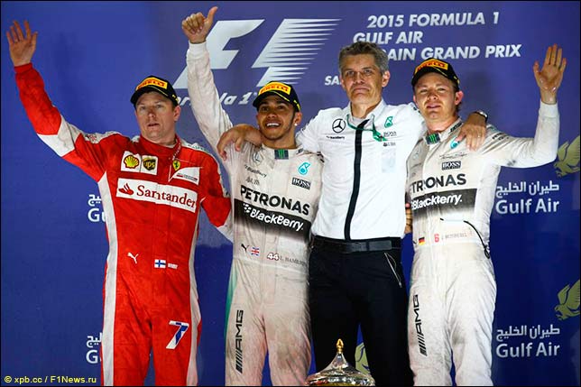 ![]() Квалификация в Бахрейне получилась любопытной, Льюис Хэмилтон завоевал четвёртый поул из четырёх в этом сезоне, но доминирования Mercedes не получилось – рядом с британцем с первого ряда стартовал Себастьян Феттель, уступив четыре десятых, а со второго ряда гонку начинали Росберг и Райкконен. После длинных серий кругов в пятницу в Mercedes с опаской говорили о гоночном темпе Ferrari, и решили рискнуть, скорректировав настройки без последующей проверки, чтобы продлить ресурс шин в гонке. Для Даниила Квята квалификация сложилась неудачно – россиянин начинал гонку только 17-м, а Дженсона Баттона стюарды допустили к старту специальным решением – в субботу у британца сломалась машина и он не проехал ни одного быстрого круга, а перед стартом в McLaren решили снять Дженсона из-за проблем с ERS – у инженеров возникли опасения, что управлять машиной может быть небезопасно. Преподнёс сюрприз Фернандо Алонсо, впервые пробившись во вторую часть квалификации за рулём McLaren Honda – испанец стартовал 14-м, а Нико Хюлкенберг дошел до финала за рулём не слишком конкурентоспособной машины Force India. Шинники привезли в Бахрейн «среднюю» пару составов, износ оказался не так уж велик, но разница в скорости получилась впечатляющей, поэтому в субботу все старались сэкономить комплекты Soft для воскресной гонки, чтобы использовать этот состав на большей части дистанции. В итоге только Мальдонадо выбрал Medium для первого отрезка гонки, остальные стартовали на Soft. Машина Фелипе Массы осталась на стартовом поле, когда гонщики отправились на прогревочный круг – бразильцу пришлось начинать гонку с пит-лейн. Сайнс ещё до старта получил пятисекундный штраф за превышение максимального времени на круге выезда из боксов – 2:16.664 вместе разрешенных 2:02.000. Мальдонадо ошибся, заняв чужую позицию на стартовом поле, и получил такой же штраф. На старте Хэмилтон сохранил лидерство, Райкконен опередил Росберга, позади лидеров шла плотная борьба за позиции. Хюлкенберг неудачно стартовал, потеряв несколько мест. Между Ферстаппеном и Мальдонадо произошел контакт без серьёзных последствий. Первая десятка на 2-м круге: Хэмилтон - Феттель - Райкконен - Росберг - Боттас - Риккардо - Грожан - Хюлкенберг - Эриксон - Сайнс. На четвёртом круге Хэмилтон оторвался от Феттеля на 1.6 секунды, обезопасив себя от атаки с помощью DRS, а Росберг опередил Райкконена, вернув третью позицию. Льюис ошибся на торможении, но сохранил лидерство и вновь оторвался. На 7-м круге Ферстаппен сменил резину и носовой обтекатель, а Масса пробился на 13-ю позицию, совершив несколько обгонов. На 8-м круге Феттель ошибся на торможении в первом повороте, и Росберг атаковал – сначала Себастьян отбил атаку, но на следующем круге Нико вышел вперёд, уступая Хэмилтону больше пяти секунд. Первая десятка на 10-м круге: Хэмилтон - Росберг - Феттель - Райкконен - Боттас - Риккардо - Грожан - Хюлкенберг - Эриксон - Перес. На 11-м круге Хюлкенберг, Наср, Масса и Мальдонадо сменили резину, на 12-м - Сайнс и Эриксон, на 13-м - Грожан, на 14-м - Феттель и Алонсо, на 15-м - Росберг, Боттас и Риккардо, на 16-м - Хэмилтон. Росберг вернулся на трассу позади Феттеля, бросился в атаку, на следующем круге на прямой вышел вперёд – Льюис выехал из боксов прямо перед ними. На 17-м круге Райкконен, лидировавший в гонке, провёл пит-стоп, получив Medium на второй отрезок, а тройка лидеров исп