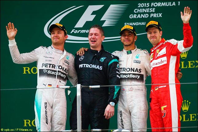 ![]() Льюис Хэмилтон и Себастьян Феттель уверенно выиграли в Австралии и Малайзии, и перед стартом в Шанхае многие отказывались назвать фаворита – у Mercedes было явное преимущество в квалификации, но на длинных сериях кругов машины Ferrari почти не уступали, а с резиной работали чуть более аккуратно. В субботу Льюис завоевал поул – третий из трёх в сезоне – в борьбе с Росбергом на этот раз всё решили четыре сотых. Со второго ряда стартового поля гонку начинали Феттель и Масса, с третьего – Боттас и Райкконен. Mercedes, Ferrari и Williams в полном составе на трёх первых рядах – как месяц назад в Мельбурне. Шинники привезли «среднюю» пару составов, разница в скорости оказалась достаточно большой. Soft обеспечивал лучшее сцепление и изнашивался не так быстро, как несколько лет назад, когда шины теряли эффективность уже через пару кругов, но Medium выдерживал большую дистанцию. Определяющим фактором для выбора длины отрезка и стратегии гонки был износ передней левой шины. Квят и Сайнс выбрали Medium для первого отрезка, остальные стартовали на Soft. На старте обошлось без инцидентов. Хэмилтон сохранил лидерство, в первой тройке порядок не изменился. Райкконен опередил двух гонщиков Williams. Риккардо плохо стартовал, откатившись на 17-ю позицию. Хюлкенберг опередил Квята, Сайнса развернуло во втором повороте, но он продолжил борьбу. Первая десятка на 2-м круге: Хэмилтон - Росберг - Феттель - Райкконен - Масса - Боттас - Грожан - Наср - Эриксон - Мальдонадо. На 3-м круге Мальдонадо опередил Эриксона. На 5-м Перес обогнал Квята. Инженер попросил Даниила не препятствовать Риккардо, поскольку он стартовал на Soft и использовал другую стратегию, но Квят оборонялся – несколько поворотов гонщики боролись, потом Даниэль вышел вперёд. Гонщики Mercedes обменялись лучшими кругами, но создать серьёзного отрыва от Ferrari не удавалось – к 7-му кругу четверых пилотов разделяли пять секунд, а гонщики Williams постепенно отставали. На 9-м круге Мальдонадо опередил Насра в борьбе за восьмое место, на 10-м Ферстаппен обогнал Эриксона, едва не столкнувшись. Хюлкенберг выбыл из борьбы из-за проблем с коробкой передач. Первая десятка на 10-м круге: Хэмилтон - Росберг - Феттель - Райкконен - Масса - Боттас - Грожан - Мальдонадо - Наср - Ферстаппен. На 11-м круге Наср сменил резину, на 12-м – Мальдонадо и Перес, на 13-м – Грожан, Ферстаппен и Алонсо, на 14-м – Масса и Феттель. На 14-м круге Перес опередил Сайнса в борьбе за 16-ю позицию. На 15-м круге Риккардо, Боттас и Хэмилтон провели пит-стоп, на 16-м – Баттон, Росберг и Райкконен. В Mercedes и Ferrari выбрали Soft на второй отрезок. Машина Квята выпустила облако дыма и Даниил выбыл из борьбы из-за отказа силовой установки. Первая десятка на 17-м круге: Хэмилтон - Росберг - Феттель - Райкконен - Масса - Боттас - Мальдонадо - Грожан - Наср - Ферстаппен. Четвёрку лидеров после первого пит-стопа разделяли восемь секунд. На 18-м круге Баттон опередил Алонсо в борьбе за 15-ю позицию. На 20-м Ферстаппен обогнал Насра в борьбе за 9-е место. На 22-м Риккардо атаковал Эриксона, но выехал за пределы трассы и Маркус сохранил позицию. На 24-м круге Карлос Сайнс потерял скорость из-за проблем с коробкой передач, но вскоре коробка заработала вновь. На 27-м круге Перес провёл второй пит-стоп, на 29-м Риккардо после продолжительной борьбы смог опередить Эриксона. На 30-м Перес опередил Алонсо. На 31-м круге Феттель сменил резину. Хэ