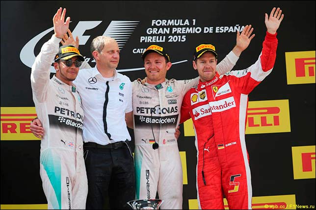 ![]() После четырёх выездных Гран При европейская часть сезона началась этапом в Барселоне. Команды подготовили множество новинок к гонке и стартующим на следующей неделе тестам, но не всем удалось добиться их эффективной работы. Многие в итоге отложили работу с новинками до тестов, а в некоторых командах гонщики использовали разные конфигурации машин. В Ferrari на машину Феттеля поставили новые решения, а Райкконен вечером в пятницу от них отказался, попросив вернуть прежнюю версию аэродинамики. Испанская трасса требовательна к аэродинамике и прижимной силе, позволяя оценить эффективность машин, и в субботней квалификации не обошлось без сюрпризов. Пять команд в полном составе пробились в финал, но больше всех удивила Toro Rosso – дебютанты Карлос Сайнс и Макс Ферстаппен заняли третью линию стартового поля, на полсекунды опередив гонщиков Red Bull Racing и разделив пары пилотов Ferrari и Wiliams. Со второго ряда гонку начинали Феттель и Боттас, а с первого – гонщики Mercedes. После четырёх подряд поулов Хэмилтона в этом сезоне, в Барселоне лучшее время в квалификации показал Нико Росберг, а Льюис жаловался на проблемы с балансом и уступил напарнику три десятых. В Pirelli привезли в Барселону «жесткую пару» составов – Hard и Medium, в квалификации многие старались сэкономить комплекты более мягких шин, но у Райкконена один комплект перегрелся в термочехлах и был испорчен. Все гонщики стартовали на Medium. На старте Росберг сохранил лидерство. Феттель опередил Хэмилтона, поднявшись на вторую позицию. Райкконен опередил двух гонщиков Toro Rosso. Квят потерял несколько позиций. Первая десятка на 2-м круге: Росберг - Феттель - Хэмилтон - Боттас - Райкконен - Ферстаппен - Сайнс - Масса - Грожан - Риккардо. Росберг быстро оторвался на дистанцию, не позволяющую атаковать с помощью DRS. На третьем круге Масса опередил Сайнса в борьбе за седьмую позицию, на четвёртом Мальдонадо и Риккардо обогнали Грожана. Мальдонадо и Риккардо опередили Сайнса. На 8-м круге Пастор обогнал и Ферстаппена. К восьмому кругу отрыв Росберга от Феттеля вырос до пяти секунд, пелотон растянулся. Первая десятка на 10-м круге: Росберг - Феттель - Хэмилтон - Боттас - Райкконен - Масса - Мальдонадо - Ферстаппен - Риккардо - Грожан. На 11-м круге Риккардо атаковал Ферстаппена, но ошибся, и Макс сохранил позицию. Хюлкенберг сменил резину. На 12-м круге Квят и Баттон провели пит-стоп, на 13-м - Наср. Хэмилтон долго ехал почти вплотную за Феттелем, но разницы в скорости не хватало для атаки и на 14-м круге его позвали в боксы для смены шин – возникла небольшая заминка при замене заднего левого колеса. На 14-м круге Риккардо и Ферстаппен сменили резину, на 15-м Феттель, Масса, Сайнс и Мальдонадо. Себастьян вернулся на трассу впереди Хэмилтона. На 16-м круге Росберг, Боттас и Грожан провели пит-стоп. Второй раз свернул в боксы Мальдонадо – для ремонта заднего антикрыла, повреждённого при контакте с Грожаном – механики просто окончательно отломали остатки правой стойки. На 17-м круге Райкконен провёл пит-стоп, на 19-м - Эриксон, при обслуживании машины возникла заминка с креплением переднего левого колеса. На 20-м Перес сменил резину, на 22-м – Алонсо. Хэмилтон прессинговал Феттеля в борьбе за вторую позицию, пробовал разные траектории, но разницы в скорости, позволяющей успешно провести обгон, не было. На 23-м круге Квят эффектно обогнал Ферста