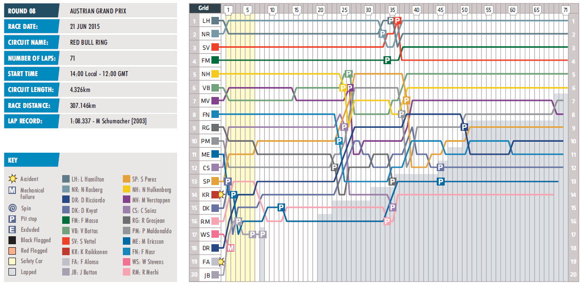 * к результату Хэмилтона добавлено пять секунд за пересечение белой линии на выезде с пит-лейн Причины сходов: К.Сайнс - Toro Rosso - 36 - механические проблемы Р.Грожан - Lotus - 36 - коробка передач Д.Баттон - McLaren - 9 - датчик расхода топлива У.Стивенс - Manor - 2 - утечка масла К.Райкконен - Ferrari - 1 - авария Ф.Алонсо - McLaren - 1 - авария Положение в ЛИЧНОМ ЗАЧЕТЕ после Гран-При АВСТРИИ
