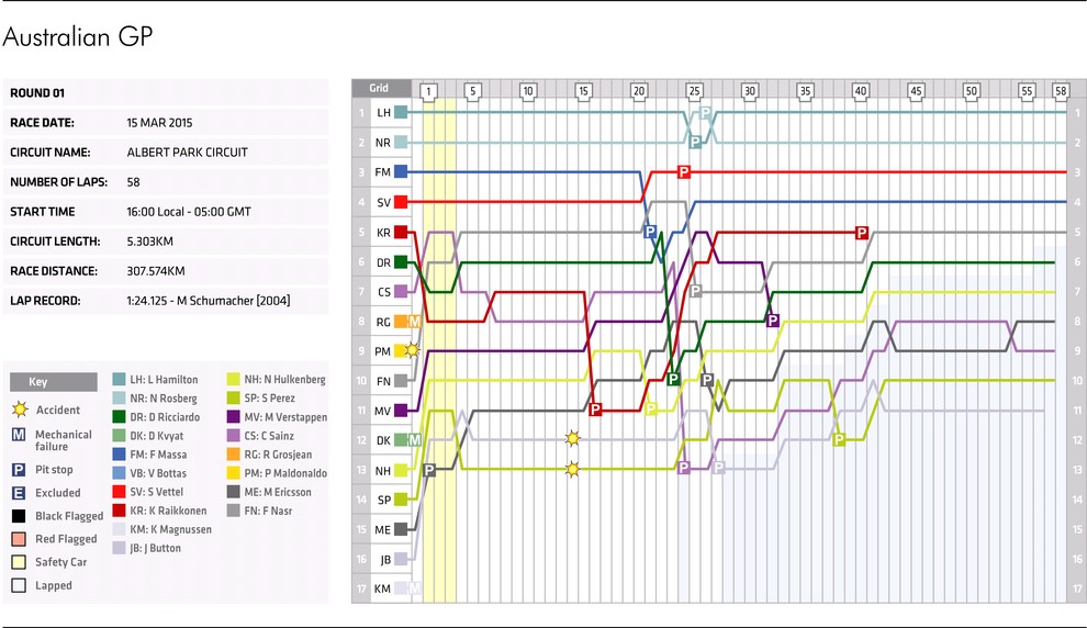 ![]() В Мельбурне подтвердились многие тенденции, наметившиеся на зимних тестах. Гонщики Mercedes лидировали во всех тренировках, а в квалификации преимущество выигравшего поул Льюиса Хэмилтона над ближайшим соперником из другой команды оказалось даже большим, чем в конце прошлого сезона. Позади пары лидеров борьба в квалификации получилась острой – пилотов Williams и Ferrari разделили сотые. Со второго ряда гонку начинали Масса и Феттель, а с третьего только Райкконен – Валттери Боттаса врачи не допустили на старт. После квалификации Валттери пожаловался на боль в спине, его отправили на обследование, а утром врачи FIA не допустили финна на старт – он не смог выполнить тест на скорость покидания кокпита. Последний ряд стартового поля в Мельбурне заняли гонщики McLaren Honda, но Магнуссен выбыл из борьбы до старта – после выезда из боксов на выходе из четвёртого поворота MP4-30 выпустила облако дыма и замерла на обочине. В итоге Кевин, заменяющий в этот уик-энд Фернандо Алонсо, не вышел на старт. Не смог стартовать в своей первой гонке за Red Bull Racing и Даниил Квят – на круге выезда из боксов отказала коробка передач. Надёжность – один из ключевых факторов в начале сезона. В Мельбурн приехали десять команд, но в гонке участвовало девять – в Manor Marussia не смогли подготовить машины и оборудование, не проехав за уик-энд ни одного круга. После всех потерь, на старте первой гонки выстроились только пятнадцать машин – впервые с Гран При Италии 1969 года, не считая, конечно, проблем с резиной в Индианаполисе ‘2005. Ферстаппен, Перес и Эриксон начинали гонку на Medium, остальные стартовали на Soft. На старте Хэмилтон сохранил лидерство, Сайнс задел машину Райкконена, Наср – Мальдонадо, Пастор вылетел с трассы, врезавшись в барьер. Выехал автомобиль безопасности. Грожан остановил машину в боксах из-за проблем с силовой установкой – двойной сход для Lotus на первом круге. Первая десятка за автомобилем безопасности: Хэмилтон - Росберг - Масса - Феттель - Сайнс - Наср - Риккардо - Райкконен - Ферстаппен - Хюлкенберг. На третьем круге был объявлен рестарт. Хэмилтон сохранил лидерство. Наср опередил Сайнса в борьбе за пятую позицию, потом Карлоса обогнали Риккардо и Райкконен. Первая десятка на 10-м круге: Хэмилтон - Росберг - Масса - Феттель - Наср - Риккардо - Райкконен - Сайнс - Ферстаппен - Хюлкенберг. Гонщики Mercedes постепенно отрывались от Массы, к 14-му кругу Фелипе отставал на десять секунд. В борьбе Переса и Баттона за предпоследнюю позицию произошел контакт, машину Серхио развернуло, она лишилась торцевой пластины переднего антикрыла, но продолжила движение. На 17-м круге Райкконен сменил резину – возникла заминка с креплением заднего левого колеса. На 22-м Масса и Хюлкенберг провели пит-стоп, на 24-м – Риккардо, на 25-м – Феттель и Сайнс – при обслуживании машины Карлоса возникла продолжительная заминка при креплении заднего левого колеса. На 26-м круге Хэмилтон и Наср сменили резину, на 27-м – Эриксон и Росберг, Нико вернулся на трассу позади Льюиса. На 28-м круге Баттон провёл пит-стоп, а Эриксон опередил Переса в борьбе за 11-ю позицию. На 33-м круге сменил резину Ферстаппен, стартовавший на Medium, но после возвращения на трассу машина выпустила облако дыма и дебютная гонка самого молодого пилота в истории Формулы 1 завершилась досрочно. Первая десятка на 34-м круге: Хэмилтон - Росберг - Феттель - М