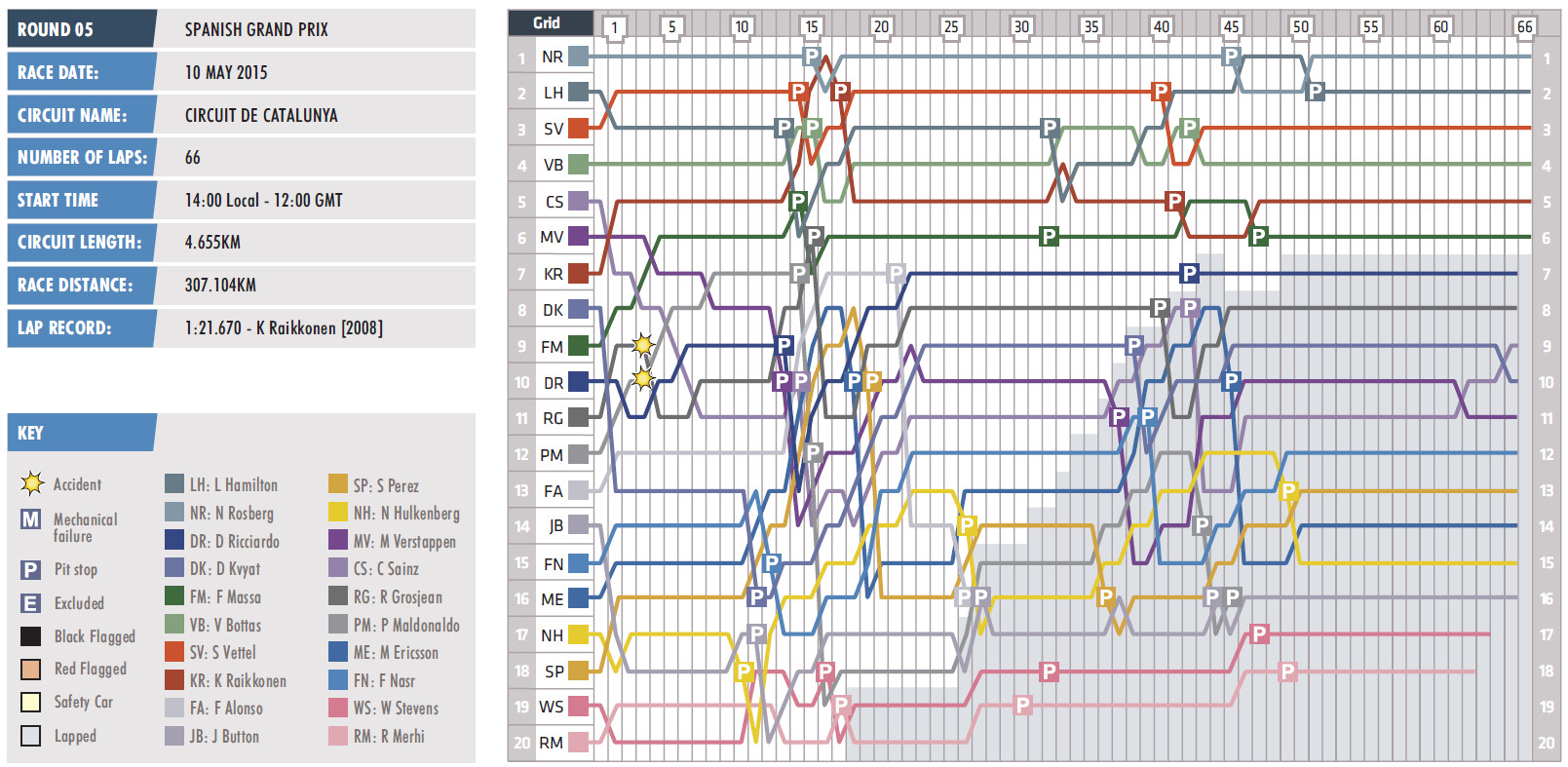 Причины сходов: П.Мальдонадо - Lotus - 46 - механические проблемы Ф.Алонсо - McLaren - 27 - тормоза Положение в ЛИЧНОМ ЗАЧЕТЕ после Гран-При ИСПАНИИ