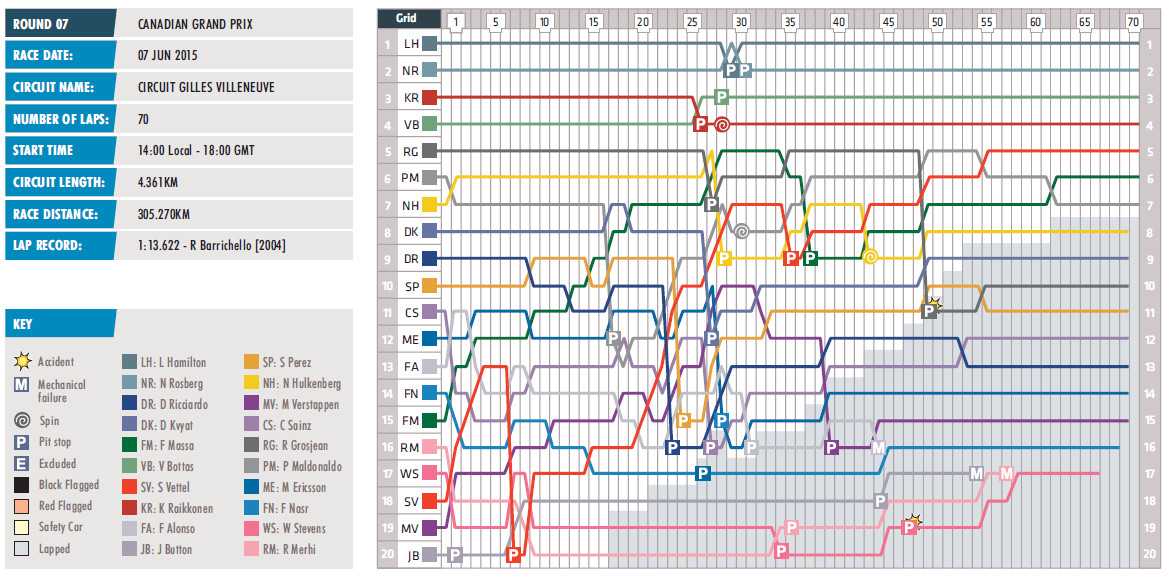 Причины сходов: Ф.Алонсо - McLaren - 47 - выхлопная система Д.Баттон - McLaren - 58 - выхлопная система Р.Мери - Manor - 62 - привод Положение в ЛИЧНОМ ЗАЧЕТЕ после Гран-При КАНАДЫ