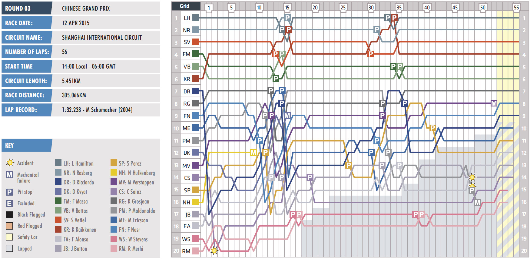 Причины сходов: П.Мальдонадо - Lotus - 49 - тормоза Д.Квят - Red Bull Racing - 15 - мотор Н.Хюлкенберг - Force India - 9 - коробка передач Положение в ЛИЧНОМ ЗАЧЕТЕ после Гран-При КИТАЯ