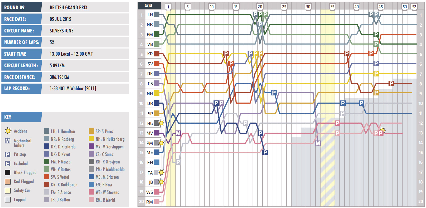 Причины сходов: К.Сайнс - Toro Rosso - 31 - Д.Риккардо - Red Bull - 21 - электроника силовой установки М.Ферстаппен - Toro Rosso - 3 - вылет П.Мальдонадо - Lotus - 0 - авария Р.Грожан - Lotus - 0 - авария Д.Баттон - McLaren - 0 - авария Ф.Наср - Sauber - 0 - коробка передач Положение в ЛИЧНОМ ЗАЧЕТЕ после Гран-При ВЕЛИКОБРИТАНИИ