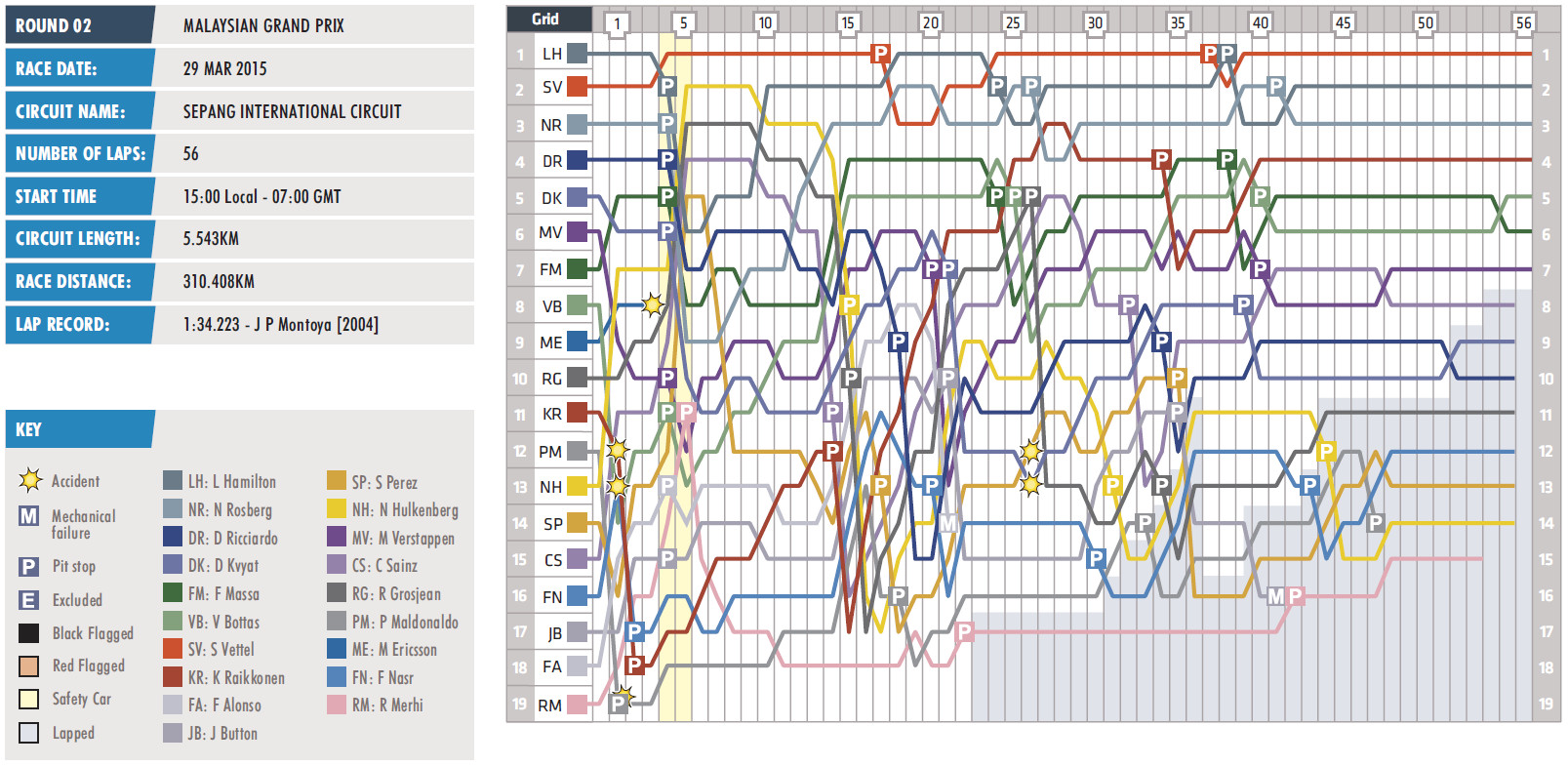 ![]() Солнечно. Сухо. Воздух+33…34С, трасса +62…54С Жара и грозы – традиционные факторы интриги Гран При Малайзии. В пятницу асфальт раскалился до 60 градусов, а квалификация третий год подряд оказалась дождевой – и закончилась с таким же результатом, как и год назад: Хэмилтон – Феттель – Росберг. Грожан потерял две позиции на стартовом поле по решению стюардов – в квалификации он выехал на трассу в обход очереди на пит-лейн, а гонщики Manor были допущены на старт специальным решением. По ходу уик-энда ходили слухи, что у Manor нет технической возможности одновременно выпускать на трассу обе машины. На тренировках гонщики выезжали по очереди, в квалификации и гонке машину Стивенса оставили в боксах из-за проблем с топливной системой, а Мери получил возможность дебютировать в Формуле 1. Шинники традиционно привезли в Малайзию два самых жестких состава. Во второй квалификационной сессии гонщики успели проехать быстрый круг на Medium до того, как начался дождь, и должны были использовать этот комплект на старте. В итоге Баттон и Алонсо стартовали на Hard, остальные начинали гонку на Medium. На старте первая тройка сохранила позиции, Масса опередил Квята, Ферстаппен и Эриксон коснулись, у Мальдонадо – после контакта с Боттасом, и у Райкконена – после инцидента с Насром – произошел прокол. Первая десятка на 2-м круге: Хэмилтон - Феттель - Росберг - Риккардо - Масса - Квят - Хюлкенберг - Эриксон - Грожан - Ферстаппен. На четвёртом круге Эриксон атаковал Хюлкенберга, ошибся на торможении и вылетел в гравий. Выехал автомобиль безопасности. Многие сменили резину, в том числе гонщики Mercedes, но не все – и Феттель возглавил гонку. Этот момент сыграл важную роль. Первая десятка за автомобилем безопасности: Феттель - Хюлкенберг - Грожан - Сайнс - Перес - Хэмилтон - Риккардо - Масса - Росберг - Ферстаппен. В конце шестого круга автомобиль безопасности свернул в боксы. Хэмилтон опередил Переса, воспользовавшись их борьбой, Серхио обогнал и Риккардо, а потом – Росберг, Ферстаппен и Квят. На 10-м круге Росберг опередил Массу, Хэмилтон – Сайнса. Феттель оторвался от Хюлкенберга на 10 секунд, за Нико собралась большая группа гонщиков – и первым его обогнал Хэмилтон. Риккардо атаковал Сайнса, ошибся на торможении и пропустил Росберга. Первая десятка на 12-м круге: Феттель - Хэмилтон - Хюлкенберг - Грожан - Сайнс - Риккардо - Росберг - Масса - Боттас - Ферстаппен. На 13-м круге Райкконен опередил Переса в борьбе за 12-ю позицию, а Росберг – Грожана, а потом и Хюлкенберга, поднявшись на третье место. Мальдонадо получил 10-секундный штраф за превышение скорости за автомобилем безопасности. На 15-м круге Сайнс и Райкконен сменили резину, на 16-м – Хюлкенберг и Грожан, на 18-м – Феттель, вернувшись на трассу третьим. Ферстаппен и Квят опередили Риккардо. Перес и Риккардо провели пит-стоп. Первая десятка на 20-м круге: Хэмилтон - Росберг - Феттель - Масса - Боттас - Ферстаппен - Квят - Алонсо - Райкконен - Баттон. На 21-м круге Наср и Ферстаппен сменили резину, на 22-м Феттель опередил Росберга в борьбе за вторую позицию, а Баттон и Квят сменили резину. Инженер сообщил Алонсо о проблемах с охлаждением ERS – Фернандо пришлось остановиться в боксах. Феттель быстро оторвался от Росберга и бросился в погоню за Хэмилтоном, постепенно сокращая отставание на более мягкой резине. На 23-м круге Ферстаппен эффектно опередил Ри