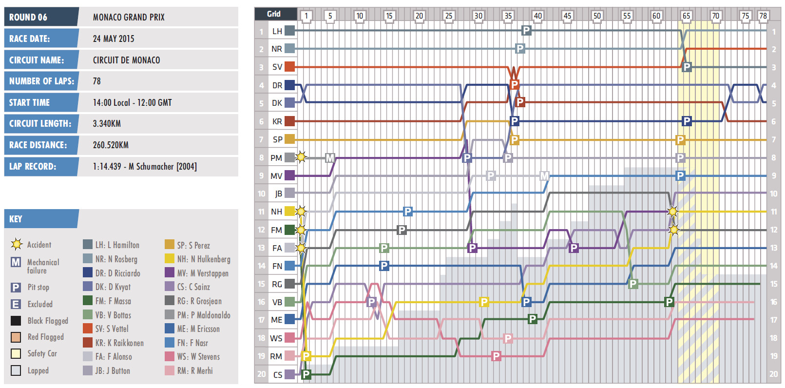 Причины сходов: М.Ферстаппен - Toro Rosso - 63 - авария Ф.Алонсо - McLaren - 42 - перегрев П.Мальдонадо - Lotus - 6 - тормоза Положение в ЛИЧНОМ ЗАЧЕТЕ после Гран-При МОНАКО