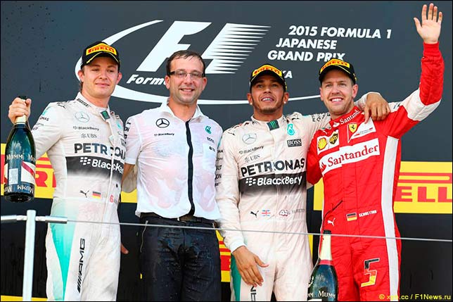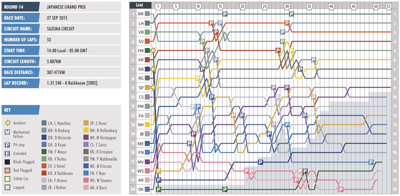 ![]() После неожиданной неудачи Mercedes в Сингапуре, в Сузуке расстановка сил вернулась к привычной. Нико Росберг завоевал поул, второй раз за сезон опередив напарника, Льюис Хэмилтон оказался вторым – гонщики Mercedes заняли первый ряд стартового поля, со второго гонку начинали Боттас и Феттель, с третьего – Масса и Райкконен. Результаты квалификации могли быть другими, если бы не красные флаги на последних секундах, не позволившие гонщикам закончить быстрый круг. Даниил Квят попал в серьёзную аварию, так что команде пришлось собрать для него машину на базе другого шасси, нарушив правила закрытого парка – Даниил начинал гонку с пит-лейн. Двое пилотов были оштрафованы потерей трёх позиций на стартовом поле – Нико Хюлкенберга наказали за столкновение с Массой в Сингапуре, а Макса Ферстаппена – за инцидент в квалификации. Шинники традиционно привезли в Сузуку «жесткую» пару – Hard и Medium, разница оказалась небольшой, около секунды на круге, но оценить износ в пятницу не удалось из-за дождя. К квалификации и гонке команды готовились утром в субботу, определяться со стратегией пришлось уже на дистанции. Баттон и Эриксон стартовали на Hard, остальные начинали гонку на Medium. На старте Хэмилтон атаковал Росберга и возглавил гонку, а Нико потерял три позиции, оказавшись за пределами трассы. Перес вылетел, но вернулся и продолжил борьбу. Риккардо и Масса допустили контакт и отправились в боксы для смены шин после прокола, вернувшись с большим отставанием. Первая десятка на 3-м круге: Хэмилтон - Феттель - Боттас - Росберг - Райкконен - Грожан - Мальдонадо - Хюлкенберг - Алонсо - Сайнс. На 5-м круге Сайнс опередил Алонсо в борьбе за девятую позицию. Наср и Ферстаппен обогнали Баттона. Эриксона развернуло в Spoon, но он продолжил движение. На 9-м круге Квят сменил резину, на 10-м – Алонсо и Ферстаппен, на 11-м – Хюлкенберг, Наср и Баттон, на 12-м – Боттас и Грожан, на 13-м – Мальдонадо. Хюлкенберг и Грожан опередили Эриксона. На 14-м круге Феттель и Эриксон провели пит-стоп, на 15-м – Райкконен и Сайнс, на 16-м – Росберг, на 17-м – Хэмилтон. На 18-м круге Росберг опередил Боттаса в шикане, Масса провёл пит-стоп, а на 19-м Перес сменил резину. Квят поднялся на 11-ю позицию и уперся в Алонсо – из-за возможных проблем с надёжностью инженер запретил Даниилу повышать мощность двигателя для обгона. Первая десятка на 20-м круге: Хэмилтон - Феттель - Росберг - Боттас - Райкконен - Хюлкенберг - Грожан - Мальдонадо - Сайнс - Алонсо. На 21-м круге Квят сменил резину. Перес опередил Насра в борьбе за 14-ю позицию. На 26-м круге Риккардо провёл пит-стоп, а Ферстаппен обогнал Алонсо в борьбе за десятое место – испанец сравнил мотор Honda с двигателями GP2. На 28-м круге Эриксон, Баттон и Сайнс сменили резину. При заезде на пит-лейн Карлос сбил ограничитель, и ему пришлось заменить носовой обтекатель. Квят на торможении перед шиканой опередил Насра. На 29-м круге Райкконен провёл пит-стоп, на 30-м – Алонсо, Росберг и Боттас. В Ferrari сразу ответили на действия Mercedes пит-стопом Феттеля, но Себастьян вернулся на трассу позади Росберга. На 31-м круге Хэмилтон, Ферстаппен и Наср сменили резину, на 32-м – Хюлкенберг, на 34-м – Грожан, на 35-м – Квят, на 36-м – Масса, на 37-м – Мальдонадо и Перес. Первая десятка на 38-м круге: Хэмилтон – Росберг - Феттель - Райкконен - Боттас - Хюлкенберг - Грожан - Мальдонадо - Сайнс - Ферстаппен. Стивенс превысил ск