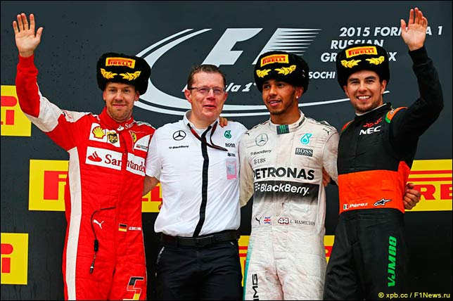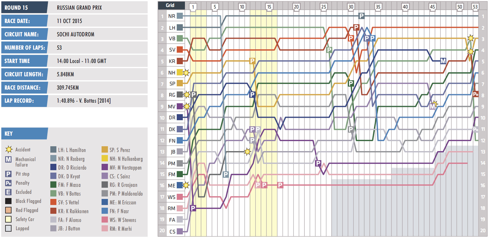 ![]() Подготовиться к гонке на свободных заездах в Сочи командам толком не удалось – в пятницу помешали пролитое на трассу дизельное топливо и дождь, в субботу – серьёзная авария Карлоса Сайнса. К счастью, с Карлосом всё обошлось – вечером в субботу он покинул больницу, а утром в воскресенье в Toro Rosso подтвердили его участие в гонке – правда, машину пришлось собирать заново. Перегрузка во время аварии достигла 46g. В квалификации поул завоевал Росберг – Нико и его инженерам удалось в сжатые сроки найти оптимальные настройки, так что серьёзной борьбы с Хэмилтоном не было – Льюис уступил три десятых, но гонщики Mercedes вновь заняли весь первый ряд стартового поля. Со второго стартовали Боттас и Феттель, с третьего – Райкконен и Хюлкенберг. Даниил Квят начинал гонку 11-м. Алонсо и Мери были наказаны потерей позиций за замену элементов силовых установок, но на стартовом поле Мери даже поднялся на одну строчку из-за того, что Сайнс был допущен к старту отдельным решением стюардов. В прошлом году в Pirelli перестраховались, выбрав «среднюю» пару составов, но на очень гладком асфальте Сочи Автодрома резина почти не изнашивалась и не прогревалась. На этот раз шинники привезли более мягкие составы, но в квалификации гонщикам вновь пришлось работать сериями кругов, чтобы вывести шины в рабочий режим. На свободных заездах командам не удалось поработать длинными сериями, определяться со стратегией пришлось по ходу гонки, контролируя износ шин и действия соперников. Мальдонадо, Масса, Эриксон и Алонсо стартовали на Soft, остальные начинали гонку на SuperSoft. На старте Хэмилтон атаковал Росберга, но Нико сохранил лидерство. Райкконен опередил Боттаса и Феттеля, поднявшись на третье место. Квят поднялся на 7-е. Хюлкенберга развернуло во втором повороте, его зацепил Эриксон – оба гонщика выбыли из борьбы. Грожан и Ферстаппен отправились в боксы для замены носовых обтекателей и шин. Выехал автомобиль безопасности. Первая десятка за автомобилем безопасности: Росберг - Хэмилтон - Райкконен - Боттас - Феттель - Перес - Квят - Риккардо - Баттон - Наср. На 4-м круге был объявлен рестарт. Росберг сохранил лидерство. Боттас опередил Райкконена, вернувшись на третье место. Росберг сообщил инженеру о проблемах с педалью газа, на 7-м круге Хэмилтон опередил напарника, захватив лидерство в гонке. Нико потерял скорость, пропустив Боттаса и обоих гонщиков Ferrari, и свернул в боксы, где сошел с дистанции. Масса и Мальдонадо опередили Баттона, Сайнс обогнал Алонсо, поднявшись на 12-е место после старта с 20-го. Первая десятка на 10-м круге: Хэмилтон - Боттас - Райкконен - Феттель - Перес - Квят - Риккардо - Наср - Масса - Мальдонадо. На 12-м круге на выходе из третьего поворота в серьёзную аварию попал Грожан – в затяжном повороте машина не удержалась на трассе, врезавшись в барьер. Роман самостоятельно покинул кокпит. Выехал автомобиль безопасности. Перес, Риккардо, Сайнс, Баттон, свернули в боксы. На следующем круге Алонсо сменил резину. Первая десятка за автомобилем безопасности: Хэмилтон - Боттас - Райкконен - Феттель - Квят - Наср - Масса - Мальдонадо - Перес - Риккардо. Ремонт барьера и очистка трассы потребовали времени. На 17-м круге был объявлен рестарт. Хэмилтон сохранил лидерство. Феттель атаковал Райкконена, Кими выехал за пределы трассы, а вернувшись пропустил напарника. Сайнс получил пяти
