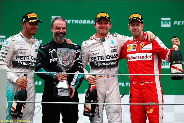 ![]() Как и в 2014-м, бразильский этап не завершал сезон, а предшествовал финалу в Абу-Даби, но если год назад судьба титула решалась в последней гонке, то в 2015-м Льюис Хэмилтон досрочно гарантировал титул в Остине, а Кубок конструкторов достался Mercedes ещё раньше, в Сочи. Расстановка команд в Кубке конструкторов могла измениться лишь при особом стечении обстоятельств, но в личном зачёте борьба продолжалась за все позиции, кроме первой, так что бразильская гонка для многих имела принципиальное значение. В субботу Росберг выиграл квалификацию, завоевав пятый поул подряд – гонщики Mercedes стартовали с первого ряда, Ferrari со второго – Феттель в 15-й раз за сезон опередил Райкконена, а с третьего гонку начинали Хюлкенберг и Квят – Даниил в субботу назвал решающий круг лучшим в сезоне. Трое гонщиков потеряли позиции на стартовом поле из-за штрафов. Боттас – три места за обгон в пятницу под красными флагами, Наср – три места за блокировку Массы в квалификации. Риккардо стартовал предпоследним после замены трёх элементов силовой установки, а Алонсо последним – у него мотор отказал в начале квалификации и он был допущен на старт решением стюардов. В FIA планировали провести перед стартом минуту молчания в память о погибших в авариях на гражданских дорогах – в международный день памяти, но после теракта в Париже программу изменили. На параде пилотов гонщики надели повязки в память о жертвах теракта, на платформе, с которой они приветствовали зрителей, установили французский флаг с черной траурной лентой. А за 15 минут до старта, во время минуты молчания команды и болельщики почтили память жертв автомобильных аварий. Свободные заезды и квалификация прошли на сухой трассе при жаркой погоде – сцепление оставляло желать лучшего, машины скользили, резина быстро изнашивалась, но в воскресенье резко похолодало, а небо затянули облака. В Pirelli привезли в Интерлагос «среднюю» пару составов – Medium и Soft, более мягкие шины быстро теряли эффективность, более жесткие позволяли проехать большую дистанцию, но на разных машинах ситуация отличалась, что давало командам большую свободу при выборе стратегии. На формировочном круге машина Карлоса Сайнса остановилась на трассе – её пришлось вернуть в боксы, а испанец начинал гонку с пит-лейн. Мальдонадо и Сайнс стартовали на Medium, остальные начинали гонку на Soft. На старте Росберг сохранил лидерство, Боттас поднялся на пятое место, Хюлкенберг откатился на седьмое. Машина Сайнса вновь остановилась на трассе – мотор потерял мощность. Первая десятка на 2-м круге: Росберг - Хэмилтон - Феттель - Райкконен - Боттас - Квят - Хюлкенберг - Масса - Перес - Ферстаппен. На 4-м круге Риккардо сменил резину. На 5-м Алонсо опередил Мальдонадо, Грожан – Насра. Росберг оторвался от Хэмилтона на дистанцию, не позволяющую Льюису использовать DRS. На 10-м круге Хюлкенберг провёл пит-стоп, на 11-м – Квят, Перес, Грожан и Масса – при обслуживании машины бразильца произошла небольшая заминка. Квят вернулся на трассу позади Хюлкенберга. На 12-м круге Боттас и Ферстаппен сменили резину, на 13-м – Райкконен, Баттон и Эриксон, на 14-м – Росберг, Феттель и Алонсо, на 15-м – Хэмилтон и Наср. После пит-стопа Хэмилтон сократил отставание от Росберга, Нико прибавил, но и Льюис взвинтил темп, подобравшись на дистанцию, позволяющую использовать DRS. Гонщиков несколько круг