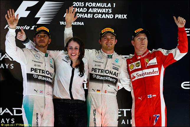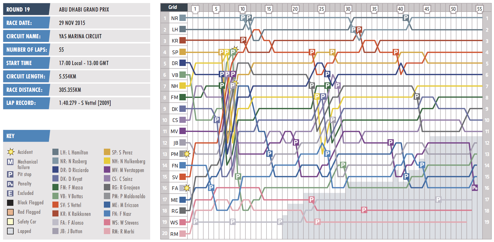![]() В 2015-м судьба титула и обладателя Кубка конструкторов решилась досрочно, а к финальной гонке сезона были определены позиции большинства гонщиков и команд. Локальные сражения продолжались, в частности – за четвёртое место в личном зачёте между Райкконеном и Боттасом, между Квятом и Риккардо за седьмое – этап в Абу-Даби окончательно расставил всё по местам. На тренировках и в квалификации доминировали гонщики Mercedes, заняв весь первый ряд стартового поля. Росберг завоевал шестой поул подряд – Хэмилтон уступил больше трёх десятых. Со второго ряда стартовали Райкконен и Перес, с третьего – Риккардо и Боттас, Квят начинал гонку девятым. В субботу два чемпиона мира выбыли из борьбы уже в первой квалификационной сессии, Алонсо – из-за прокола, а Феттель – из-за уверенности команды в том, что результата, показанного в первой попытке будет достаточно. Стивенс получил штраф с потерей пяти мест на старте за замену блока управления силовой установки, Грожан – за замену коробки передач, а Мери начинал гонку с пит-лейн – в Manor нарушили условия закрытого парка, обслуживая его машину. Позиции остальных пилотов соответствовали протоколу квалификации. Днём на старте воскресной гонки GP2 произошла масштабная авария из-за которой пострадали защитные барьеры во втором повороте – гонку отменили, расписание скорректировали, но к старту Гран При барьеры успели восстановить. В Pirelli традиционно привезли в Абу-Даби «мягкую» пару составов. Как и в прошлом году, в гонке команды сделали ставку на Soft – более жесткие шины позволяли проехать большую дистанцию, а более мягкие быстро гранулировались и теряли эффективность. Феттель, Эриксон, Грожан, Стивенс и Мери стартовали на Soft, остальные начинали гонку на SuperSoft. На старте Росберг сохранил лидерство. Алонсо врезался в Мальдонадо, и Пастор сошел из-за поломки подвески. Алонсо сменил резину и носовой обтекатель. Сайнс выдавил Квята за пределы трассы, Даниил потерял несколько мест, но вернулся и опередил Ферстаппена. Первая десятка на 2-м круге: Росберг - Хэмилтон - Райкконен - Перес - Хюлкенберг - Риккардо - Сайнс - Масса - Квят - Боттас. Росберг быстро оторвался на дистанцию, не позволяющую атаковать с помощью DRS. Масса опередил Сайнса в борьбе за седьмую позицию, Грожан – Насра в борьбе за 14-ю. На пятом круге Наср сменил резину, на 6-м – Квят. Риккардо опередил Хюлкенберга в борьбе за пятую позицию. Стюарды наказали Алонсо штрафным проездом по пит-лейн за инцидент с Мальдонадо. Феттель опередил Ферстаппена. На 7-м круге Перес, Риккардо и Масса провели пит-стоп, на 8-м – Хюлкенберг и Сайнс – при обслуживании машины Карлоса возникла заминка. На 9-м круге Боттас, Ферстаппен и Баттон сменили резину. Дженсон и Валттери столкнулись на пит-лейн – Боттаса выпустили, когда Баттон проезжал мимо, в итоге финн выехал на трассу с повреждённым передним антикрылом, на следующем круге вновь побывал в боксах и получил пятисекундный штраф. На 11-м круге Росберг и Райкконен провели пит-стоп, на 12-м – Хэмилтон. Риккардо, Масса и Квят опередили Эриксона, Перес – Грожана. Хэмилтон обогнал не побывавшего в боксах Феттеля, а потом Себастьян пропустил Райкконена. На 16-м круге Эриксон сменил резину, на 19-м – Алонсо. Ферстаппен опередил Сайнса в борьбе за 11-ю позицию – команда приказала Карлосу пропустить напарника, он пытался спорить, но выполн
