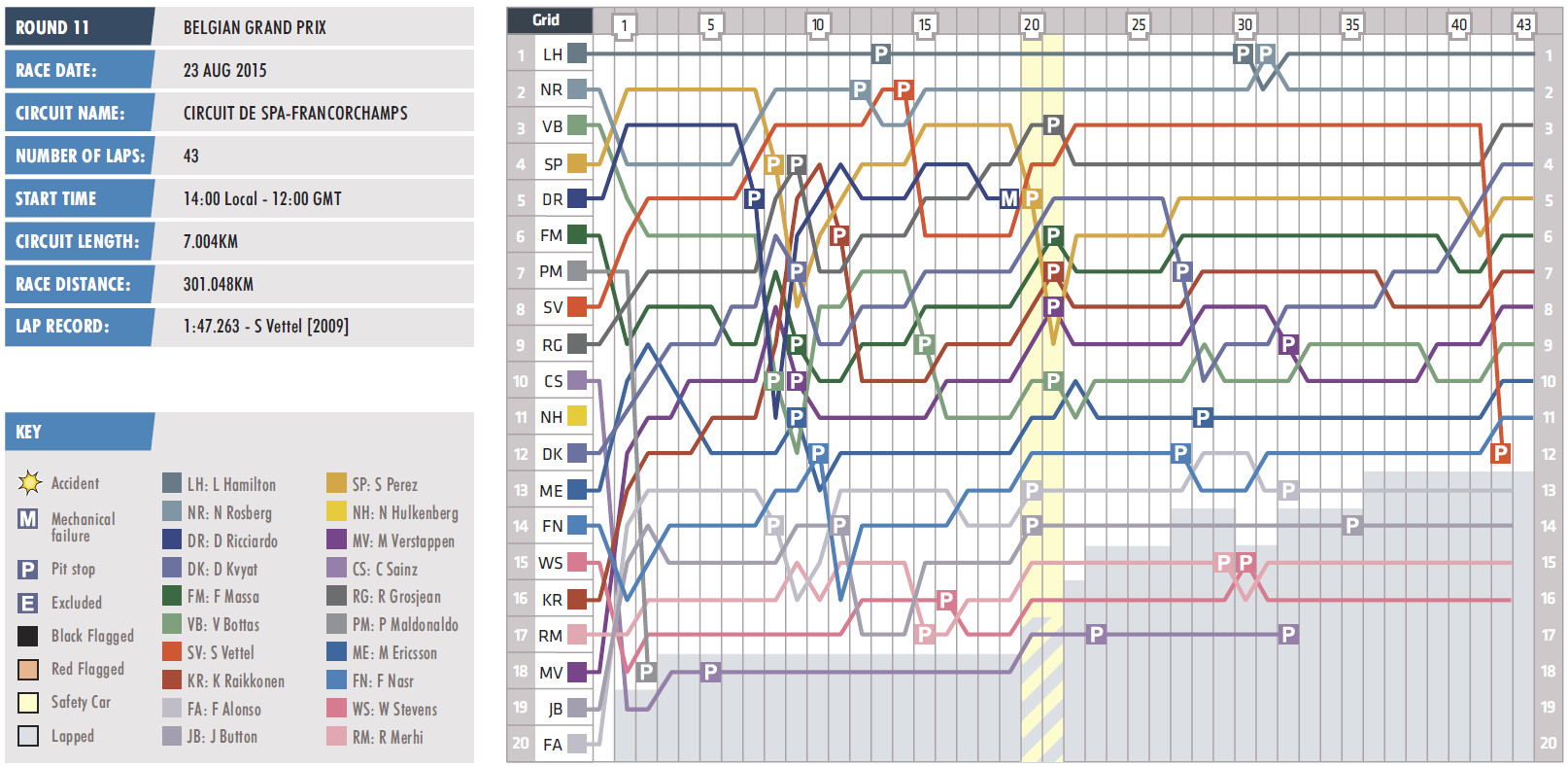 ![]() В Спа всегда много говорят о погоде, но на этот раз повод для обсуждения был другим, чем обычно – уик-энд получился непривычно жарким и солнечным, а дождь ни разу не вмешивался в работу гонщиков. На тренировках и в квалификации доминировали гонщики Mercedes, поул уверенно завоевал Льюис Хэмилтон, опередив напарника почти на полсекунды, но при определении расстановки гонщиков на стартовом поле пришлось учесть множество штрафов на общую сумму в 125 позиций! Потерей 5 позиций были наказаны Грожан и Райкконен, 10 – Ферстаппен, 50 – Баттон, 55 – Алонсо. В McLaren Honda решили дважды за уик-энд заменить силовые установки на обеих машинах, чтобы на неподходящей им трассе отбыть штрафы на несколько гонок вперёд. Фактические потери позиций были не столь велики, отложенные штрафы отменили ещё в июле – в итоге полностью отбыл наказание только Грожан. С первого ряда стартовали Хэмилтон и Росберг, со второго – Боттас и удививший в квалификации Перес, с третьего – Риккардо и Масса. Лучшей позицией Ferrari, отмечающей 900-й старт в Гран При, стало девятое место Феттеля, Даниил Квят начинал гонку 12-м. На семи машинах в первой десятке стояли моторы Mercedes. Шинники привезли в Спа «среднюю» пару составов – Medium и Soft. Более мягкий состав обеспечивал заметное преимущество в скорости, а вот износ на длинной серии кругов оценить не удалось – в пятницу тренировки прерывались красными флагами, так что со стратегией команды определялись по ходу гонки. Начиная с этапа в Спа, в FIA изменили правила стартовой процедуры, запретив помощь гонщикам со стороны команд при выборе момента срабатывания сцепления и ограничив радиообмен. По ходу уик-энда гонщики не раз тренировали старт по новым правилам, но стартовать по ним в гонке предстояло впервые. На прогревочном круге Нико Хюлкенберг пожаловался на потерю мощности, и команда сначала приказала ему вернуться в боксы, а потом передумала – Нико занял свою позицию на стартовом поле, но в момент старта поднял руки, сигнализируя о проблемах. Гонщики отправились на дополнительный прогревочный круг, а машину Нико откатили в боксы. На втором прогревочном круге Сайнс пожаловался на потерю мощности и свернул в боксы. Только Наср, Алонсо и Баттон выбрали Medium на первый отрезок гонки, остальные стартовали на Soft. На старте Хэмилтон сохранил лидерство, Росберг потерял несколько позиций. Перес атаковал Хэмилтона в борьбе за лидерство и вышел вперёд, но Льюис вернул позицию. Росберг и Феттель опередили Боттаса. На втором круге Мальдонадо выбыл из борьбы из-за проблем с мотором. Сайнс выехал на трассу. На третьем круге Квят опередил Эриксона в борьбе за девятую позицию. Первая десятка на 3-м круге: Хэмилтон – Перес - Риккардо - Росберг - Феттель - Боттас - Грожан - Масса - Квят - Эриксон. На 4-м круге Ферстаппен опередил Эриксона, поднявшись на 10-е место. На 5-м и Райкконен обогнал Маркуса. Хэмилтон быстро отрывался от Переса, а Риккардо постепенно подбирался к Серхио. На 6-м круге Квят опередил Массу в борьбе за восьмую позицию. На 8-м круге Риккардо сменил резину, а Грожан опередил Боттаса. На 9-м Перес, Боттас и Алонсо провели пит-стоп. На машине Боттаса механики перепутали составы, поставив три шины Soft и одну Medium – и по ходу гонки стюарды наказали гонщика штрафным проездом по пит-лейн. На 10-м круге Грожан, Квят, Масса, Ферстаппен и Эриксон сменили резину, на 11-м 