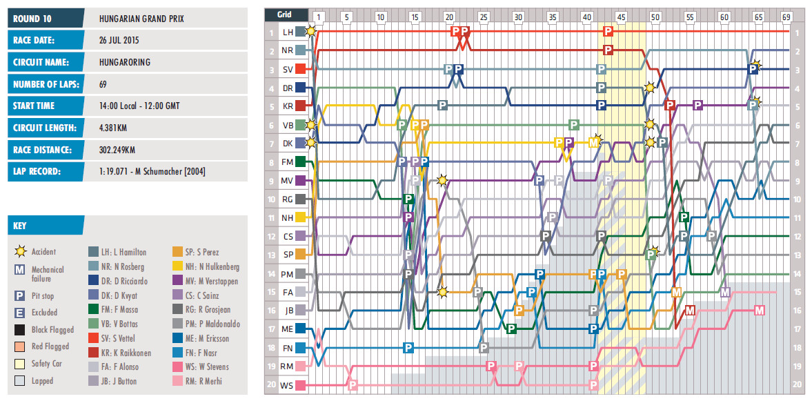 ![]() В 2015-м Хунгароринг принимал тридцатую гонку Формулы 1 в своей истории. Любопытно, как за эти годы изменилось отношение к венгерской трассе – когда-то её активно критиковали, называя чуть ли не лишней в календаре, а сейчас это один из традиционных Гран При со своей интригой и интересной историей. Ключевые факторы гонки, которая всегда проходила в самые жаркие недели лета, остались прежними. Узкая трасса, неровное покрытие, высокая температура воздуха и асфальта и в этот уик-энд доставили немало проблем, но в воскресенье жара спала – почти на десять градусов по сравнению с субботой, так что командам пришлось вносить коррективы. Как всегда, многое в Венгрии зависело от квалификации, удачного старта и эффективной стратегии. По ходу всех тренировок и квалификации лидировал Льюис Хэмилтон, завоевавший в субботу пятый поул в своей карьере на венгерской трассе – и уже девятый в сезоне. Нико Росберг на этот раз уступил достаточно много – больше полсекунды, но всё же занял вторую позицию на стартовом поле. Со второго ряда стартовали Феттель и Риккардо, с третьего – Райкконен и Боттас. Даниил Квят начинал гонку седьмым. Шинники привезли в Венгрию «среднюю» пару составов, на тренировках и в квалификации гонщики жаловались на шины Medium, называя их слишком жесткими для венгерской трассы. Разница в скорости с Soft оказалась большой – около двух секунд, так что даже топ-командам пришлось использовать более мягкую резину в первой части квалификации, чтобы не рисковать. При более прохладной погоде в день гонки разница несколько снизилась, но команды старались минимизировать использование шин Medium в гонке. За несколько дней до Гран При Венгрии гонщики ездили в Ниццу на похороны Жюля Бьянки. На машинах и шлемах были надписи в память о Жюле, семья погибшего гонщика приехала на Хунгароринг, перед стартом прошла очень эмоциональная минута молчания. Гонщики и члены семьи Бьянки встали в круг, сложив шлемы в центре. Только Мальдонадо выбрал Medium на первый отрезок гонки, остальные стартовали на Soft. С первого раза начать гонку не удалось – Фелипе Масса ошибся при расположении машины на стартовом поле и получил пятисекундный штраф, а гонщикам пришлось проехать дополнительный прогревочный круг. Хэмилтон стартовал неудачно, гонку возглавил Феттель. Райкконен с Росбергом вели борьбу за второе место и Кими вышел вперёд. Риккардо потерял несколько позиций и допустил контакт с Боттасом. Хэмилтон ошибся в шестом повороте, вылетел в гравий и откатился на десятое место. Первая десятка на 2-м круге: Феттель - Райкконен - Росберг - Боттас - Квят - Хюлкенберг - Риккардо - Перес - Масса - Хэмилтон. Квят пожаловался на вибрацию и инженер сообщил, что он не должен сдерживать Риккардо. После повторной просьбы на восьмом круге Даниил пропустил напарника. На 10-м круге Хэмилтон опередил Массу – в плотной борьбе произошел небольшой контакт. Риккардо опередил Хюлкенберга. Первая десятка на 12-м круге: Феттель - Райкконен - Росберг - Боттас - Риккардо - Хюлкенберг - Квят - Перес - Хэмилтон - Масса. На 13-м круге Хэмилтон опередил Переса в борьбе за восьмую позицию, а Риккардо обогнал Боттаса в борьбе за четвёртую. На 14-м круге Квят и Боттас сменили резину, на 15-м – Масса, Ферстаппен, Баттон, Грожан и Наср. Гонщики Ferrari ехали в отличном темпе, к 15-му кругу Росберг уступал лидеру восемь секун