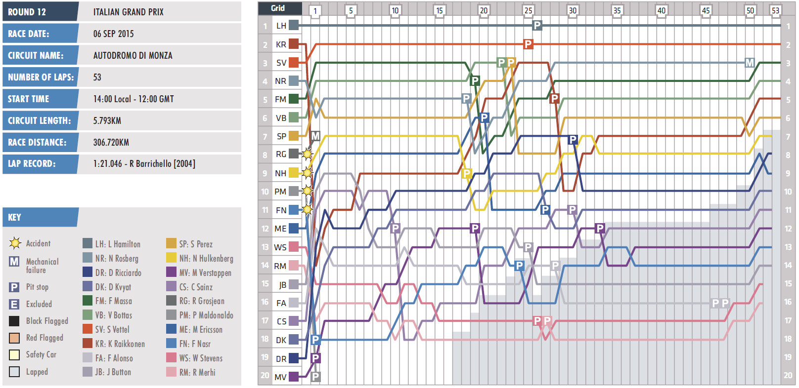 ![]() Семь раз за последние десять лет гонку в Монце выигрывал обладатель поула, в том числе последние пять лет подряд – хорошая стартовая позиция на итальянской трассе очень важна, борьба в квалификации получилась напряженной. Одиннадцатый поул в сезоне завоевал Льюис Хэмилтон, а вот Нико Росберг уступил не только напарнику, но и гонщикам Ferrari. С первого ряда гонку начинали Хэмилтон и Райкконен, со второго Феттель и Росберг. В Mercedes и Ferrari привезли в Италию доработанные версии силовых установок, но в квалификации и гонке Росберг использовал старый мотор, отработавший уже пять Гран При – с новым после субботней тренировки возникли проблемы, и его заменили, а ночью выяснилось, что проблемы были связаны с утечкой в системе охлаждения. В Red Bull Racing и Toro Rosso выбрали этап в Монце для двойной замены силовых установок, чтобы отбыть штрафы на трассе, где на хороший результат из-за дефицита мощности рассчитывать не приходилось. Поменяли элементы силовых установок и в McLaren. По сумме штрафов Риккардо был наказан потерей 50 мест, Сайнс и Квят – 35, Ферстаппен – 30, Алонсо – 10 и Баттон – 5. Кроме того, Эриксон потерял три позиции за блокировку Хюлкенберга в квалификации. Рекорд штрафов, установленный в Спа, удалось превзойти – на всех гонщики были наказаны потерей 168 позиций. Фактические потери оказались гораздо меньшими, а оштрафованные гонщики McLaren даже поднялись на одну строчку на стартовом поле относительно результатов квалификации. За полтора часа до старта, перед началом парада пилотов, в Монце прошла минута молчания в память о Джастине Уилсоне, погибшем в конце августа после аварии на этапе Indycar в Поконо. В Pirelli на этот раз привезли в Монцу «среднюю» пару составов – Medium и Soft, а после взрывов шин в Спа увеличили ограничение на минимальное давление в шинах. Составы явно лучше подходили к итальянской трассе, чем использовавшийся в прошлые годы Hard, который называли слишком жестким. Разницу между составами шинники оценивали в секунду на круге. Алонсо, Сайнс, Квят и Риккардо стартовали на Medium, остальные начинали гонку на Soft. На старте Райкконен не смог сразу двинуться с места, потом машина медленно поехала, но соперникам пришлось его объезжать. Хэмилтон сохранил лидерство. Перес опередил Росберга. У Насра произошел прокол, Фелипе и Макс Ферстаппен свернули в боксы – Макс отбывал штраф с проездом по пит-лейн за то, что команда в квалификации выпустила его машину в небезопасном состоянии. Мальдонадо и Грожан выбыли из борьбы из-за повреждений – у Пастора после контакта с Хюлкенбергом пострадала подвеска, а Роман получил удар от Насра, повредивший заднюю часть машины. Росберг опередил Переса. Райкконен отыгрывал позицию за позицией, поднявшись на 12-ю строчку. Первая десятка на 3-м круге: Хэмилтон - Феттель - Масса - Боттас - Росберг - Перес - Хюлкенберг - Эриксон - Баттон - Сайнс. На шестом круге Райкконен опередил Сайнса, а на седьмом – Баттона, поднявшись на 9-е место. Риккардо, Сайнс и Квят опередили Баттона. Хэмилтон постепенно отрывался от Феттеля, к десятому кругу выигрывая больше пяти секунд. Сайнс получил пятисекундный штраф за срезанную шикану и получение преимущества и отправился на пит-стоп. Первая десятка на 10-м круге: Хэмилтон - Феттель - Масса - Боттас - Росберг - Перес - Хюлкенберг - Эриксон - Райкконен - Риккардо. На 12-м круге Ферстаппен опередил Алонс