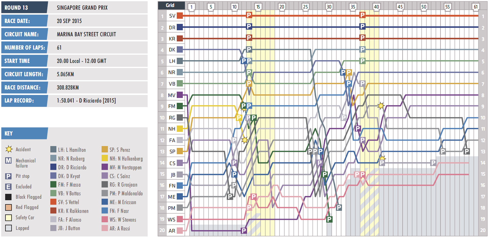 ![]() Многие команды, не использующие силовые установки Mercedes, надеялись на успех в Сингапуре – после долгого перерыва вновь использовалась конфигурация машин с высокой прижимной силой, а мощность моторов на городской трассе не имела большого значения. Клиенты Renault – Red Bull Racing и Toro Rosso – даже дважды сменили силовые установки на прошлом этапе в Монце, чтобы не рисковать штрафами в этот уик-энд, но результаты квалификации удивили многих. В Mercedes не смогли добиться эффективной работы более мягкого состава резины, имеющего внушительное преимущество в скорости, уступив в субботу Ferrari и Red Bull Racing. Квалификацию с большим преимуществом выиграл Себастьян Феттель, прервав рекордную для Ferrari серию гонок без поулов, рядом с ним с первого ряда стартовал Риккардо, а со второго ряда гонку начинали Райкконен и Квят – для россиянина четвертое место на старте было лучшим в карьере. Хэмилтон и Росберг оказались только на третьем ряду стартового поля – Льюис уступил обладателю поула почти полторы секунды! Гонщики Manor получили штрафы с потерей пяти позиций за замену коробок передач после пятничных аварий, но не потеряли ни одной – Уилл Стивенс и Александер Росси, сменивший в этот уик-энд Роберто Мери, квалифицировались на последнем ряду – с него и начинали гонку. Фактор эффективности и износа шин всегда был ключевым в Сингапуре. В Pirelli привезли «мягкую» пару – Soft и SuperSoft. Более мягкий состав имел преимущество в скорости, но кроме Mercedes ещё у нескольких команд возникли проблемы с прогревом и поддержанием рабочей температуры шин. Команды были готовы адаптировать стратегию к ситуации и возможным выездам автомобиля безопасности, ведь прежде он появлялся на трассе во всех Гран При Сингапура. На трассе с высоким расходом топлива некоторые даже рискнули залить его чуть меньше – с уверенностью в том, что какую-то дистанцию в любом случае придётся проехать в экономном режиме за автомобилем безопасности. Когда гонщики перед стартом покидали боксы, машина Росберга остановилась на выезде с пит-лейн – механикам пришлось вмешаться, но мотор вновь заглох, лишь со второй попытки Нико смог начать движение. Как и в прошлом году, все гонщики стартовали на SuperSoft. На старте Феттель сохранил лидерство. Грожан потерял три позиции. Перес атаковал Хюлкенберга, произошел небольшой контакт, но без последствий и смены позиций. Ферстаппен не смог стартовать – его машину откатили в боксы, откуда он и начал гонку с отставанием в круг. Первая десятка на 2-м круге: Феттель - Риккардо - Райкконен - Квят - Хэмилтон - Росберг - Боттас - Масса - Хюлкенберг - Перес. К началу пятого круга Феттель оторвался от Риккардо на пять секунд, за Даниэлем гонщики ехали плотной группой, но отрывы постепенно росли. Ситуация стабилизировалась. В Сингапуре сложно обгонять, поэтому многие попробовали отыграть позицию за счёт более раннего пит-стопа. На 10-м круге Грожан сменил резину, на 11-м Алонсо, Сайнс, Эриксон и Мальдонадо, при обслуживании машины Сайнса возникла небольшая заминка – он ждал, пока по пит-лейн проедут соперники. Вернувшись на трассу, Алонсо и Грожан вступили в борьбу, и Роман опередил Фернандо. На 12-м круге Хюлкенберг провёл пит-стоп, на 13-м - Квят и Масса. На выезде из боксов Фелипе и Хюлкенберг столкнулись – и машина Нико врезалась в стену. Рассмотрев обстоятельства инцидента, стюарды наказа