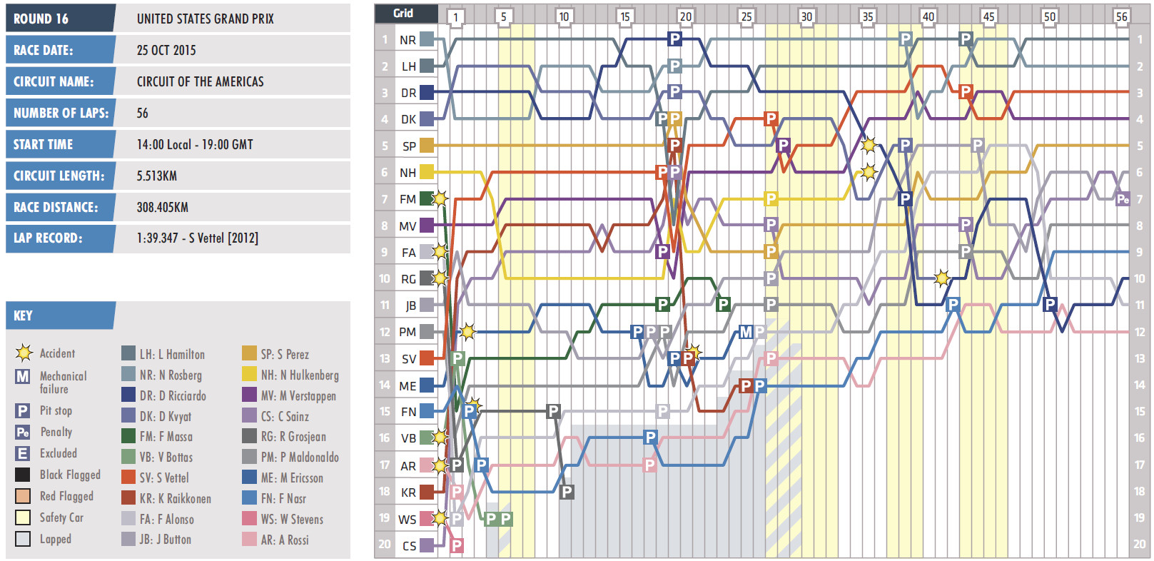 * Сайнс наказан прибавкой 5 секунд за превышение скорости на пит-лейн Причины сходов: У.Стивенс - Manor - 1 - авария В.Боттас - Williams - 6 - подвеска Р.Грожан - Lotus - 11 - тормоза Ф.Масса - Williams - 24 - подвеска К.Райкконен - Ferrari - 26 - тормоза М.Эриксон - Sauber - 26 - электрика Н.Хюлкенберг - Force India - 36 - авария Д.Квят - Red Bull - 42 - авария Положение в ЛИЧНОМ ЗАЧЕТЕ после Гран-При США