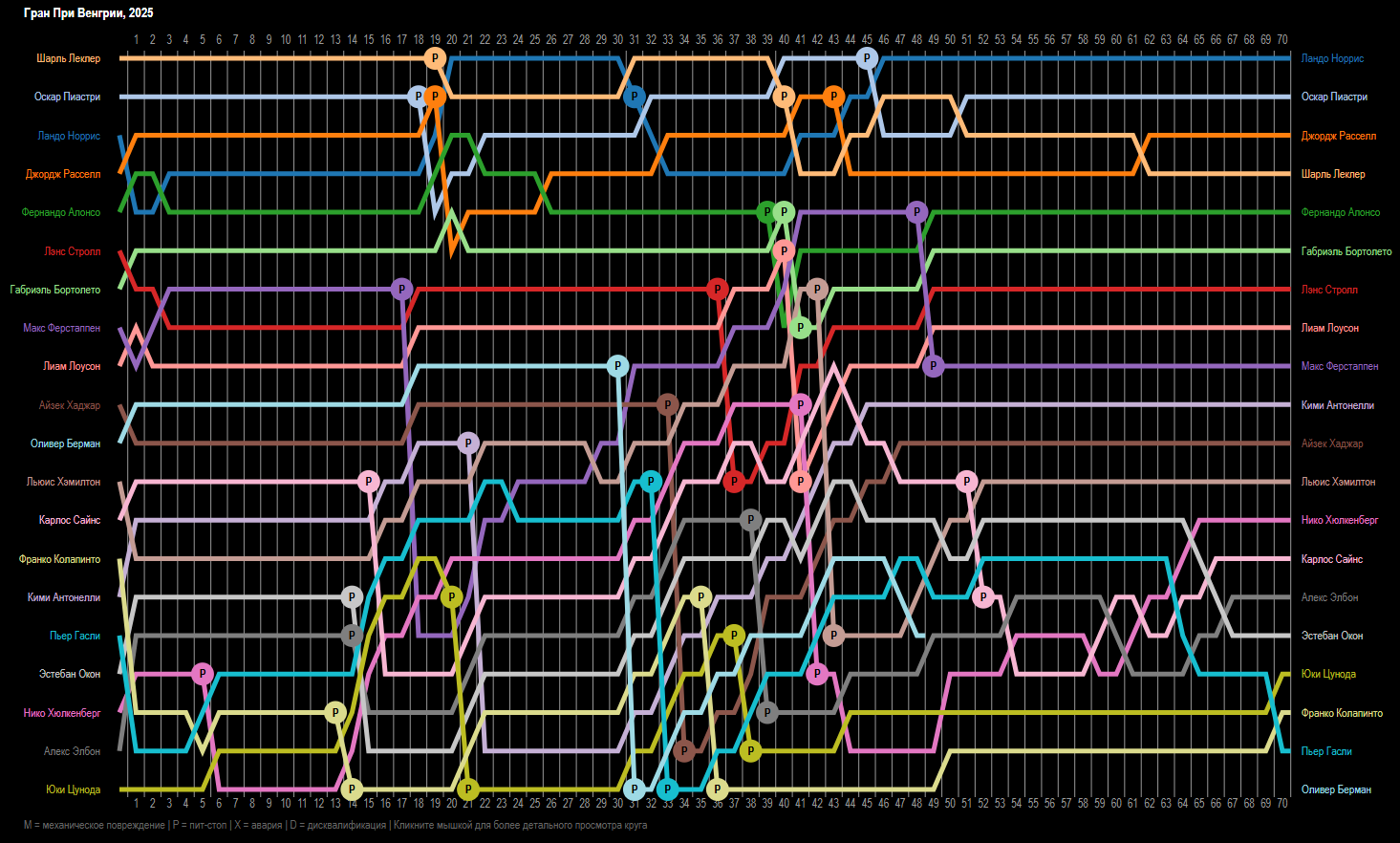 ![]() Утром на Хунгароринге шёл дождь, гонка Формулы 3 прошла в пелене брызг и изобиловала инцидентами, но днём распогодилось, и к старту Формулы 1 о дожде ничего не напоминало. По ходу уик-энда на тренировках доминировали гонщики McLaren. В пятницу Ландо Норрис дважды возглавил протокол, а утром в субботу Оскар Пиастри проехал быстрее всех. В квалификации борьба получилась плотной, первая десятка уместилась в 0,543 секунды – это новый абсолютный рекорд, а поул неожиданно для многих и для себя завоевал Шарль Леклер на Ferrari – всё буквально решили сотые. С первого ряда стартового поля гонку начинали Леклер и Пиастри, со второго – Норрис и Расселл, с третьего неожиданно прибавившие после последнего ряда на прошлой неделе в Спа Алонсо и Стролл. В Pirelli привезли на этап «мягкую» тройку составов – C3, C4 и C5 в роли Hard, Medium и Soft. В гонке Хэмилтон и Гасли стартовали на Hard, Сайнс, Хюлкенберг и Элбон на Soft, остальные на Medium. На старте Леклер сохранил лидерство. Норрис и Хэмилтон потеряли по две позиции. Лоусон опередил Ферстаппена, но на следующем круге Макс вернул позицию. Бортолето подозревался в фальстарте, но стюарды не нашли нарушений. Гравий, вылетевший из-под машины Бермана, обстрелял машину Хаджара – и попал в руку. Айзек пожаловался инженеру на травму. Хюлкенберг допустил фальстарт и получил пятисекундный штраф. Первая десятка на 2-м круге: Леклер - Пиастри - Расселл - Алонсо - Норрис - Бортолето - Стролл - Ферстаппен - Лоусон - Берман. На 3-м круге Норрис опередил Алонсо. Ферстаппен обогнал Стролла в борьбе за седьмое место. Алонсо ехал пятым, собрав за собой большую группу машин, оказавшихся в «поезде DRS», где бороться за позицию было невозможно. Гонщики ждали пит-стопа в надежде оказаться на свободной трассе, некоторые предпочли экономить шины в попытке проехать гонку с одним пит-стопом. На 6-м круге Хюлкенберг сменил шины, на 14-м – Колапинто, на 15-м – Окон и Элбон, на 16-м – Сайнс, на 18-м – Ферстаппен, на 19-м – Пиастри, на 20-м – Леклер и Расселл. Шарль вернулся впереди Пиастри и на 21-м круге опередил пропустившего его Алонсо. Расселл обогнал Бортолето. Пиастри тоже опередил Алонсо. На 21-м круге Цунода провёл пит-стоп, на 22-м – Антонелли. На 24-м круге Ферстаппен опередил Хюлкенберга, а потом и Гасли, поднявшись на 12-е место. На 26-м круге после нескольких попыток Расселл обогнал Алонсо в борьбе за четвёртое место. На 30-м круге Ферстаппен опередил Хэмилтона, вытеснив его за пределы трассы. Стюарды рассмотрели этот инцидент после финиша и оставили его без последствий. На 31-м круге Макс обогнал Хаджара. На 31-м круге Берман сменил резину, на 32-м – Норрис, на 33-м – Гасли, на 35-м – Хаджар, на 36-м – Колапинто, на 37-м – Стролл. Первая десятка на 37-м круге: Леклер - Пиастри - Расселл - Норрис - Алонсо - Бортолето - Лоусон - Ферстаппен - Хэмилтон. Норрис проехал несколько лучших кругов, чтобы после пит-стопа Леклер оказался за ним, но задел гравий, потеряв часть преимущества, а потом вновь взвинтил темп. На 38-м круге Цунода провёл пит-стоп, на 39-м – Элбон, на 40-м Алонсо, на 41-м – Бортолето, Лоусон и лидирующий Леклер, вернувшийся на трассу в семи секундах за Норрисом. На 42-м круге Хюлкенберг провёл пит-стоп, на 43-м – Хэмилтон, на 44-м – Расселл. На 45-м круге Антонелли опередил Сайнса в борьбе за 10-е место. На 46-м круге Пиастри сменил резину, вернувшись третьим, в пяти секундах за Леклером. На 47-м круг