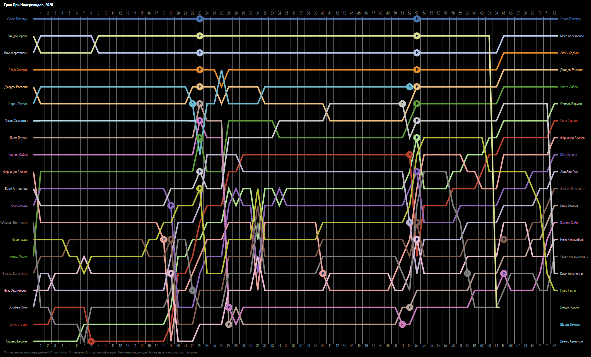 * Кими Антонелли оштрафован прибавкой 10 секунд за столкновение с Шарлем Леклером и прибавкой 5 секунд за превышение скорости на пит-лейн Лучший круг: Оскар Пиастри (McLaren) - 1:12.271 (60 круг, 212.151 км/ч) Причины сходов: Л.Хэмилтон - Ferrari - 22 - авария Ш.Леклер - Ferrari - 52 - авария Л.Норрис - McLaren - 64 - мотор Положение в ЛИЧНОМ ЗАЧЕТЕ после Гран-При НИДЕРЛАНДОВ
